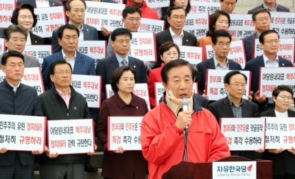 김 원내대표는 "저희가 과거 집권당 시절에도, 21일 동안 단식 농성하면서, 자식보다 어린 젊은이한테 얻어터지면서까지 (이렇게) 간절하게 요청한 적은 없었다"며 "무엇이 진실이고 거짓이냐. 그렇게 똑똑한 문재인 대통령이 드루킹 특검만은 수용하지 않겠다는 이유가 무엇이냐"며 드루킹 특검 수용을 강하게 촉구했다.