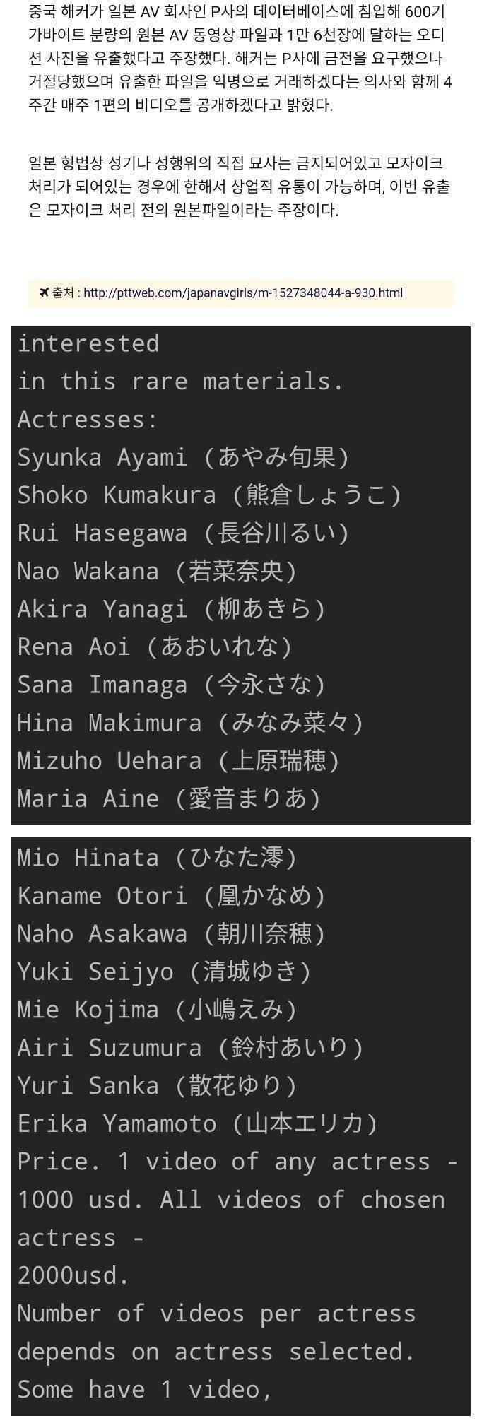 AV 회사 '프레스티지' 해킹후 무수정작 공개중인 중국 해커 작성자축구커뮤니티|작성시간18.06.03|조회수9,459 목록 댓글 35 글자크기 작게가 글자크기 크게가 유출된 배우 목록 다음검색 현재 게시글 추가 기능 열기 북마크 공유하기 신고 센터로 신고 댓글 댓글 35 댓글쓰기 답글쓰기 댓글 리스트 작성자뱅쇼 | 작성시간 18.06.03 근데 프레스티지에서 돈을 안줬다는건. 흠.. 어차피 자기들 손해 아니라고 그러는건가.. 작성자Dreamer | 작성시간 18.06.03 아... 이과갈걸... 작성자DPR Live | 작성시간 18.06.04 헐 작성자City of Manchster Stadium | 작성시간 18.06.04 이마나가 사나까지.... 작성자짜냥 | 작성시간 18.06.05 헐 댓글 전체보기