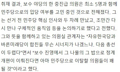 보수 야당 중진급 의원+최소 5명 민주당 입당 추진