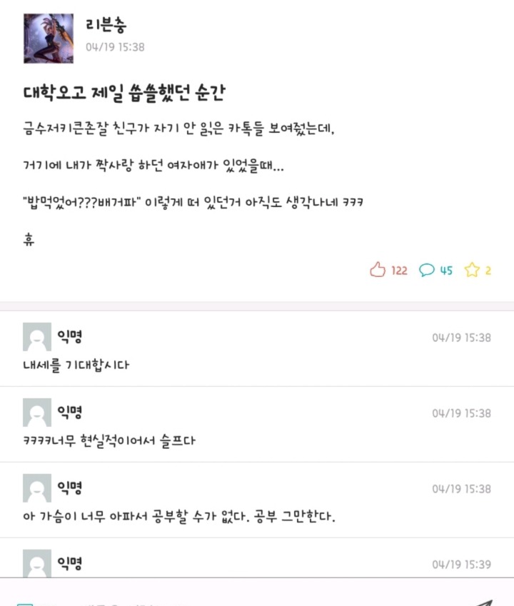 대학와서 제일 슬펐을때.jpg 작성자자유한국당|작성시간18.07.09|조회수244,025 목록 댓글 19 글자크기 작게가 글자크기 크게가 . 다음검색 현재 게시글 추가 기능 열기 북마크 공유하기 신고 센터로 신고 댓글 댓글 19 댓글쓰기 답글쓰기 댓글 리스트 작성자나무 | 작성시간 18.07.09 ㅜㅜㅜ 작성자천년왕국 | 작성시간 18.07.09 차르봄바 날리고 싶은 마음 작성자No.11 Nedbed | 작성시간 18.07.09 이번생은 글렀음 ㅜ 작성자안드레 이니에스타 | 작성시간 18.07.09 아 ㅈ같네 ㅠㅠ 작성자ご,.ご* | 작성시간 18.07.09 ㅠㅠ 댓글 전체보기
