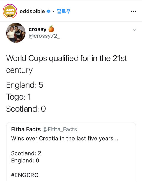 잉글랜드 놀리다가 뼈맞는 스코틀랜드인 작성자Sky Sports News|작성시간18.07.13|조회수20,124 목록 댓글 10 글자크기 작게가 글자크기 크게가 크로아티아 못 이긴거 놀렸는데21세기 월드컵 진출 못한거로 뼈맞음 다음검색 현재 게시글 추가 기능 열기 북마크 공유하기 신고 센터로 신고 댓글 댓글 10 댓글쓰기 답글쓰기 댓글 리스트 작성자PStG | 작성시간 18.07.13 2000년부터 스코틀랜드 웨일즈 북아일랜드 셋 다 월드컵 지역예선 연속 탈락 작성자우리버풀 | 작성시간 18.07.13 ㅋㅋㅋㅋㅋ 작성자메가볼트 | 작성시간 18.07.13 토고 ㅋㅋㅋㅋㅋㅋㅋ 작성자Landon Donovan | 작성시간 18.07.13 토고 북한 트리니다드토바고보다 못함 ㅋㅋ 작성자박은빈 | 작성시간 18.07.13 아일랜드 보스니아 이런 나라들도 월드컵 한번씩 갔는데 웨일즈 스코틀랜드는 왜 한번도 못갔을까 특히 웨일즈는.... 댓글 전체보기