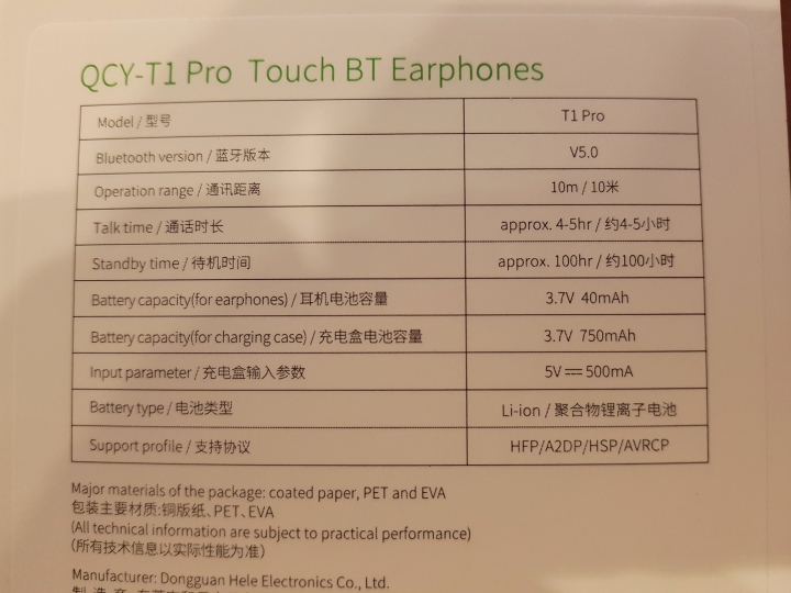구성품은 이어팁과 5핀케이블, 중국어와 영어로 된 설명서