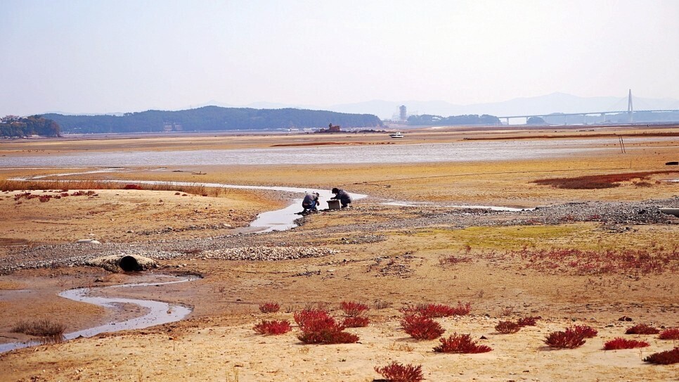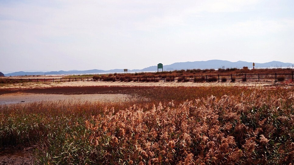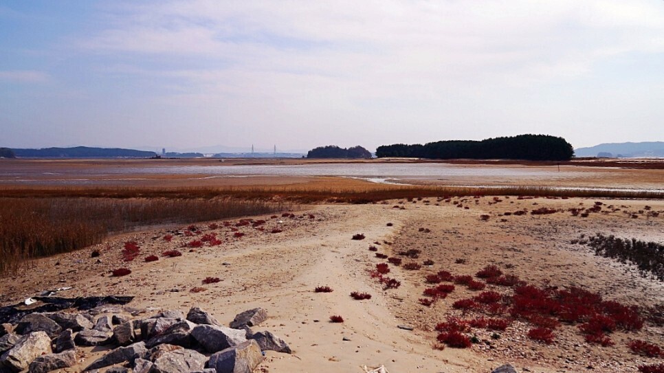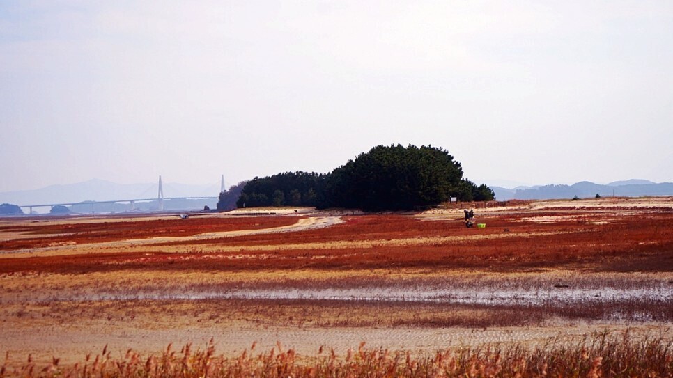 상당히 많은 사람이 해루질을 위해 즐겨 찾는 곳으로 자동차가 길가에 즐비하게 주차해놓고 갯벌을 들어가고 나오고 있었어요. 바닷물이 빠진 시간이라 그런지 갈대밭에 갈대가 바람에 나부끼고 멀리 함초의 붉은 단풍을 볼 수 있었습니다.