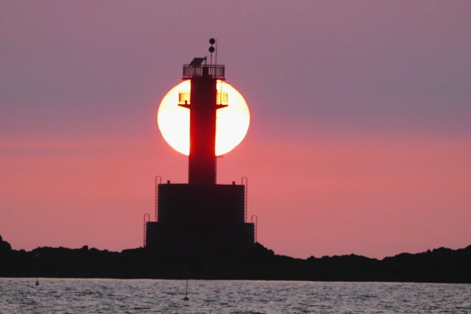 방포항 인도교 꽃다리에서 줌으로 당겨 볼 수 있는 방포항 등대, 등대와 노을이 만나면 환상적인 풍경을 자아냅니다. 마침 지고 있는 태양을 걸어두고 때론 붉은 석양에 물든 황혼 무렵의 붉은 놀을 마주합니다.