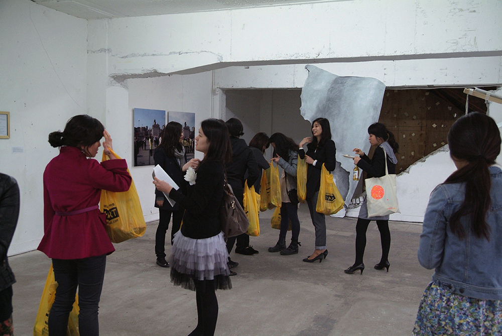 전시 오프닝 전, 전시에 참여하는 또 다른 작가들과 큐레이터 그리고 목수와 미술관 사무실 관계자들에게 설문지를 돌렸어요. 그들의 저녁 식사 취향부터 누구와 함께 먹을 것인지, 심지어 치아 건강 상태에 이르기까지 디테일한 항목들에 대한 응답을 받았죠. 그리고 전시장 인근에 있는 마트에서 그들이 집에 돌아가서 저녁을 지어먹을 수 있도록 장을 본 다음 오프닝 리셉션 날 음식재료가 든 주황색 비닐봉지를 2시간에 걸쳐 손에 들고 있게 했어요. 이 작품은 한국과 뉴욕에서 두 번 전시되었는데, 특히 뉴욕의 경우 전시회 오프닝의 참석자들이 하나같이 정장 차림으로 갖춰 입고 오는데, 그 격식 있는 차림에 가장 어울리지 않는 노란색과 주황색 비닐봉지가 그 무리 안에 배치되어 시각화되면서 기품 있는 공간의 흐름을 깨뜨렸어요. 그뿐만 아니라 하나의 전시를 준비하기 위해 그 이면에서 일하는 무수한 사람을 눈에 띄게 공적인 장소로 불러냄으로써 보이지 않는 사람들의 노력을 드러낼 수 있었죠. 사실 당일 현장에서는 사람들이 많아 비닐봉지가 묻히는 듯한 감이 없지 않았는데, 나중에 촬영된 사진으로 확인하니 여기저기서 주황색 봉지가 눈에 잘 들어오더라고요. 제목은 뒤샹의 ‘가방 속 상자 (La boîte-en-valise)’에서 차용한 것이고요.