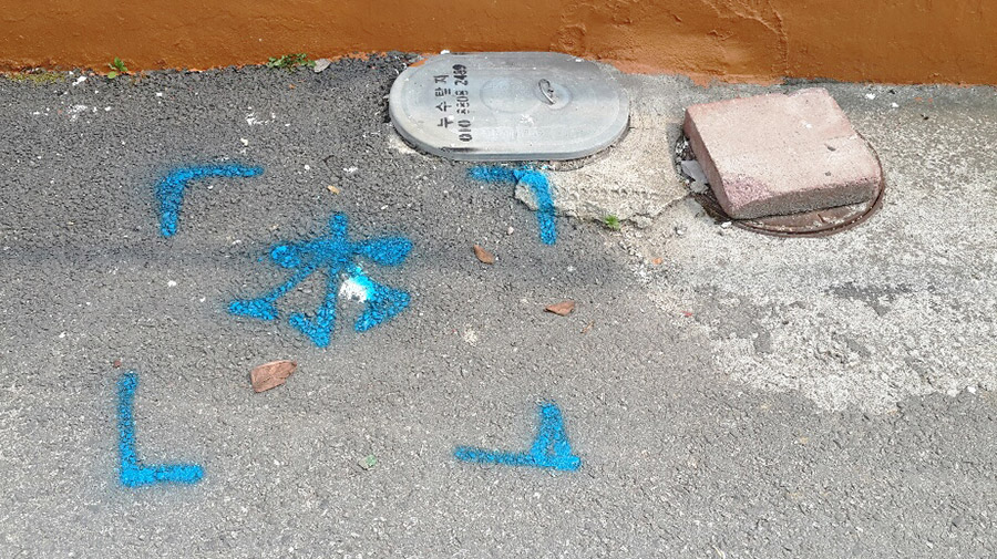 두 사람은 콘크리트 바닥에 얇은 구멍을 뚫어 더 정확한 소리를 들었다. 그렇게 찾아낸 누수 지점 4곳에 파란색으로 물 수자(水)를 표시하고, 상수도 공사 업체에 연락했다.