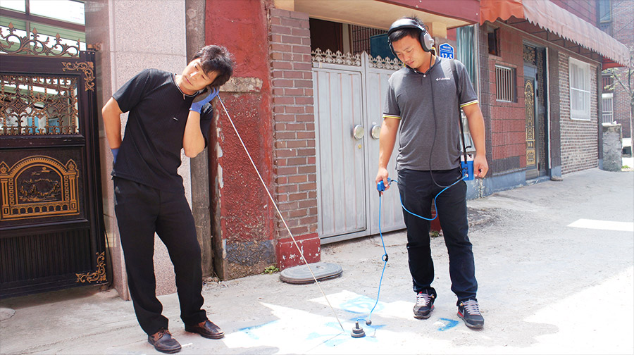 하지만 정확한 누수 위치를 찾는 것은 사람의 몫이다. 이 대리와 이 주임은 담배 굵기의 관에 길이가 1m가 넘는 청음봉을 바닥에 대고, 귀를 기울여 가만히 들었다. 골목을 지나던 할머니가 두 사람을 신기한 듯 바라봤다. 두 사람은 익숙하다는 듯 할머니께 ‘상수도 새는 곳을 찾고 있다’고 설명 드린 뒤, 작업을 계속했다.