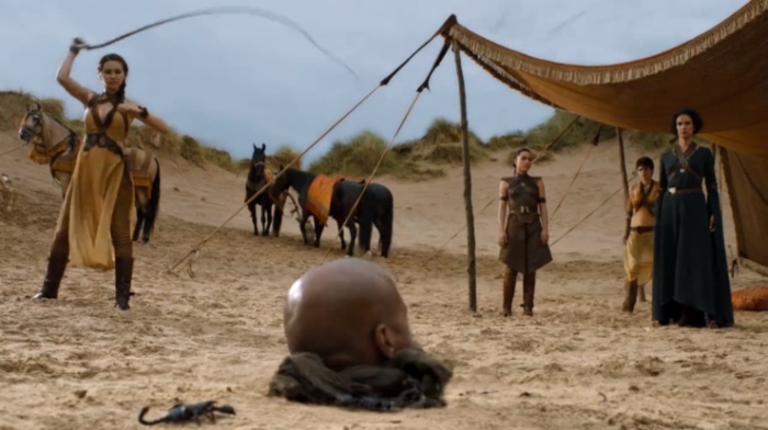 대너리스가 용을 타고 날라 버리자, 다른 용 한 마리라도 훔쳐 보려고 하지만 구워지고 만다..