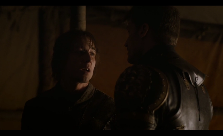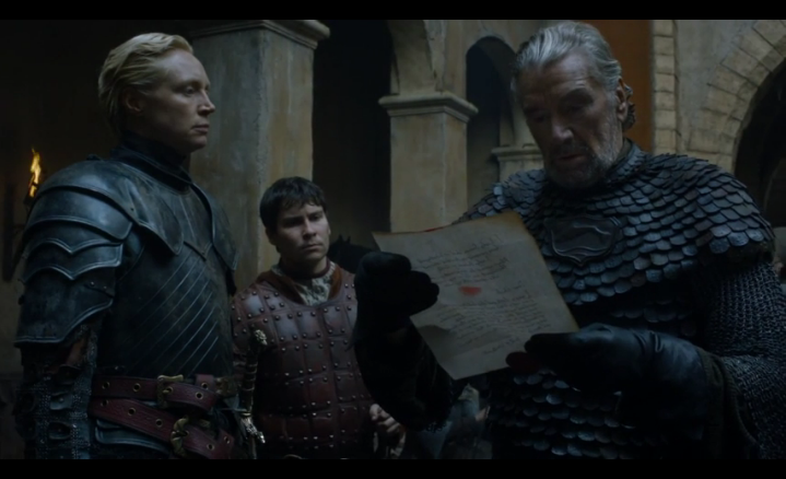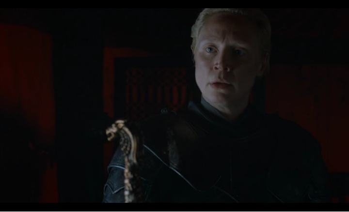 : 산사를 구했다는 보고를 제이미에게 하고, 임무를 마쳤으니 발라리아 명검인 "오스키퍼"를 돌려주려고 합니다. 제이미는 그 검은 브리엔느의 것이라고 답하네요. 브리엔느는 블랙피쉬에게 항복을 협상해보겠다고 리버런성으로 보내달라고 요청합니다. 제이미는 힘들것이라 말하지만 승낙을 합니다. 오늘 해질때까지 시간약속을 받습니다.