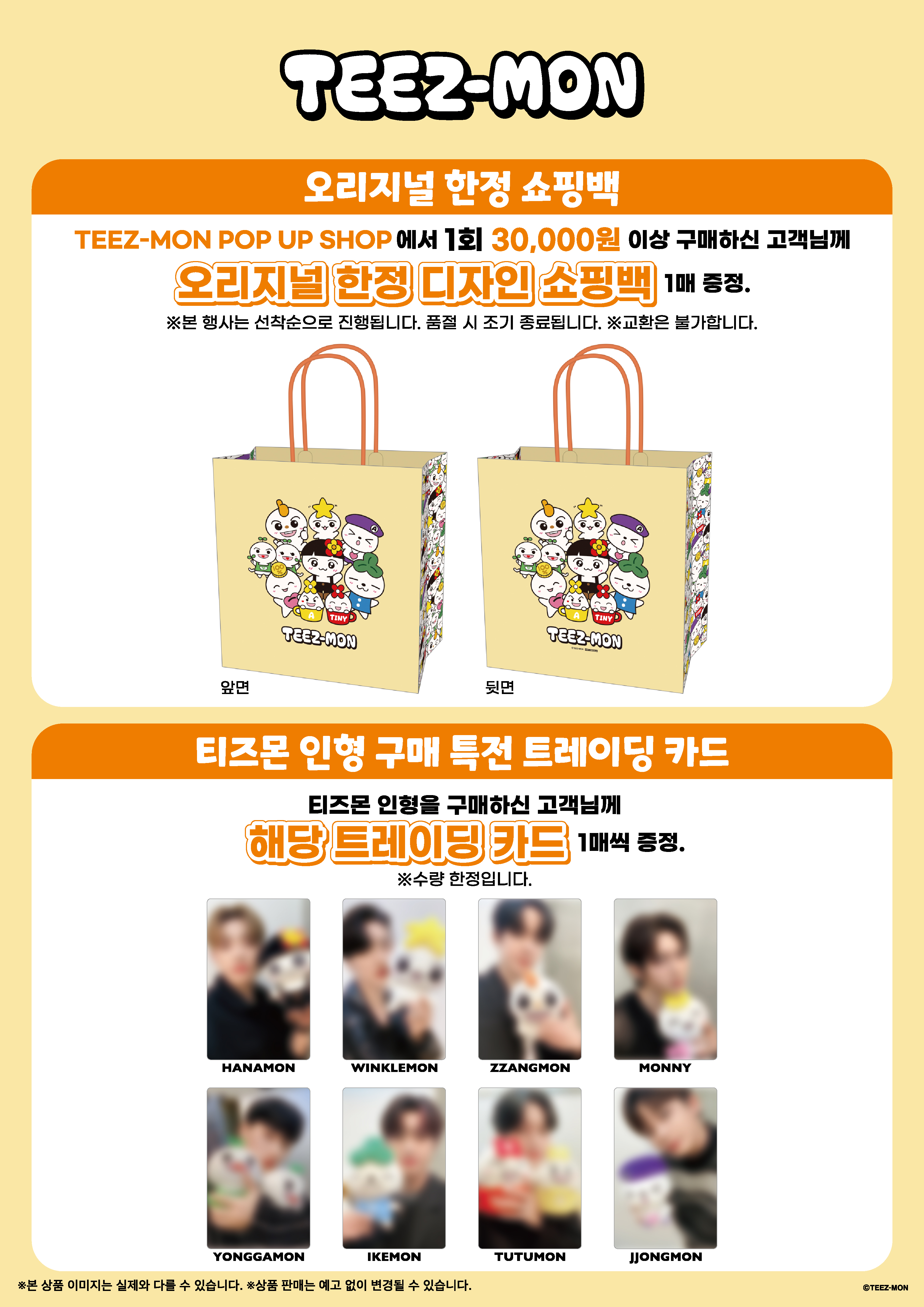 - TEEZ-MON POP-UP SHOP에서 상품 30,000원 이상 구매하신 분들에 한하여 구매 1건 당 디자인 쇼핑백 1매를