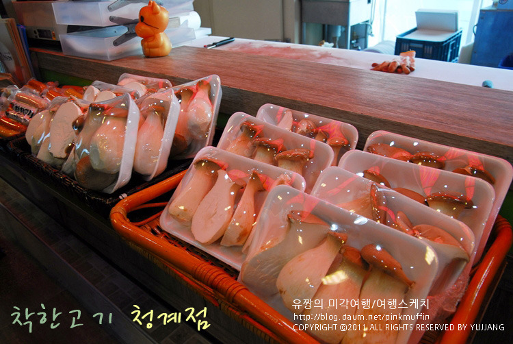 고기를 보관하는 냉동창고와 썰어진 고기를 진열하고 판매하는 정육쇼케이스옆엔 버섯,소세지등 사서 바로 구워먹을 수 있는 재료등이 올려있다.