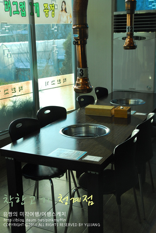 고동색테이블과 검정색의자로 이루어진 1층 착한고기 청계점 모습.