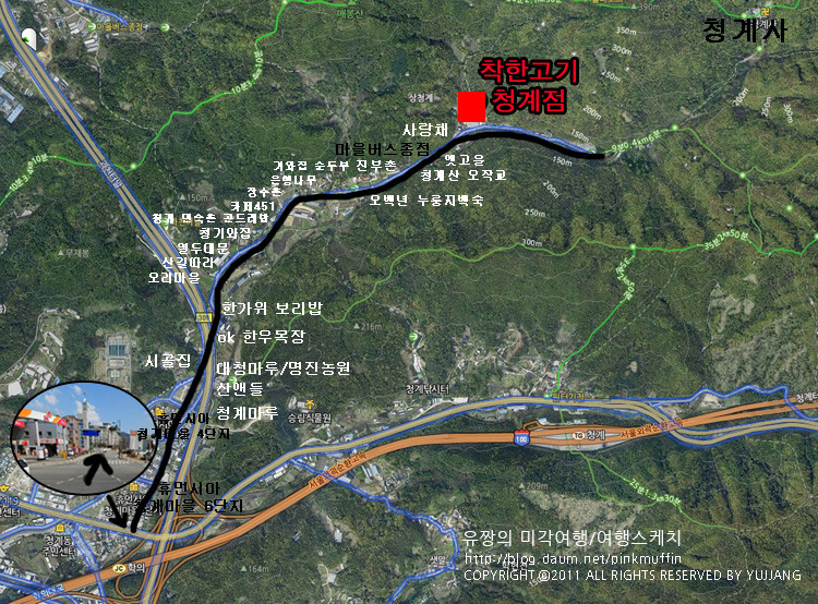 청계사 올라가는 길이 시작되는 sk주유소로부터 약 2.84km 정도 차를 타고 올라가면 착한고기 청계점이 자리잡고 있다.