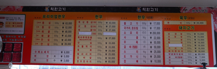 정육점식당답게 질좋은 고기와 상차림비용, 기타식재료등을 따로 비요을 결재해 먹는 방식.