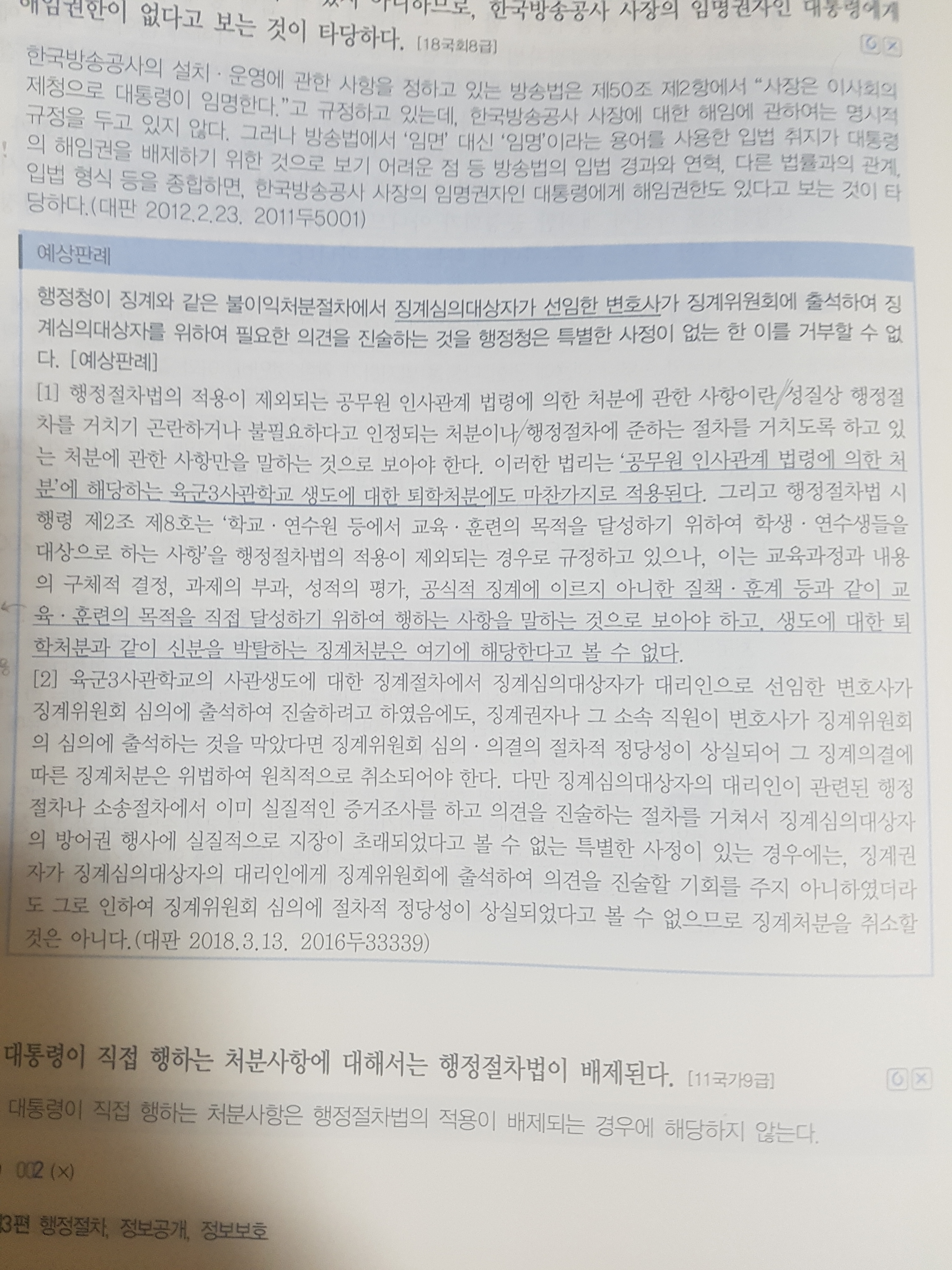 행정절차법 작성자유 은|작성시간20.01.22|조회수536 목록 댓글 1 글자크기 작게가 글자크기 크게가 사진에 예상판례에서 전반부랑 후반부 해석이 헷갈리는데요ㅜㅜ 결국 육군3사관학교 생도에 대한 퇴학처분도 행정절차법이 적용되는 게 아니라 공무원 징계와 마찬가지로 국가공무원법상의 절차가 적용된다는 건가요? 다음검색 현재 게시글 추가 기능 열기 북마크 공유하기 신고 센터로 신고 댓글 댓글 1 댓글쓰기 답글쓰기 댓글 리스트 작성자윤우혁 | 작성시간 20.01.22 퇴학의 경우에는 국가공무원법이 적용되고 그에 이르지 않으면 행정절차법이 적용된다는 겁니다. 댓글 전체보기