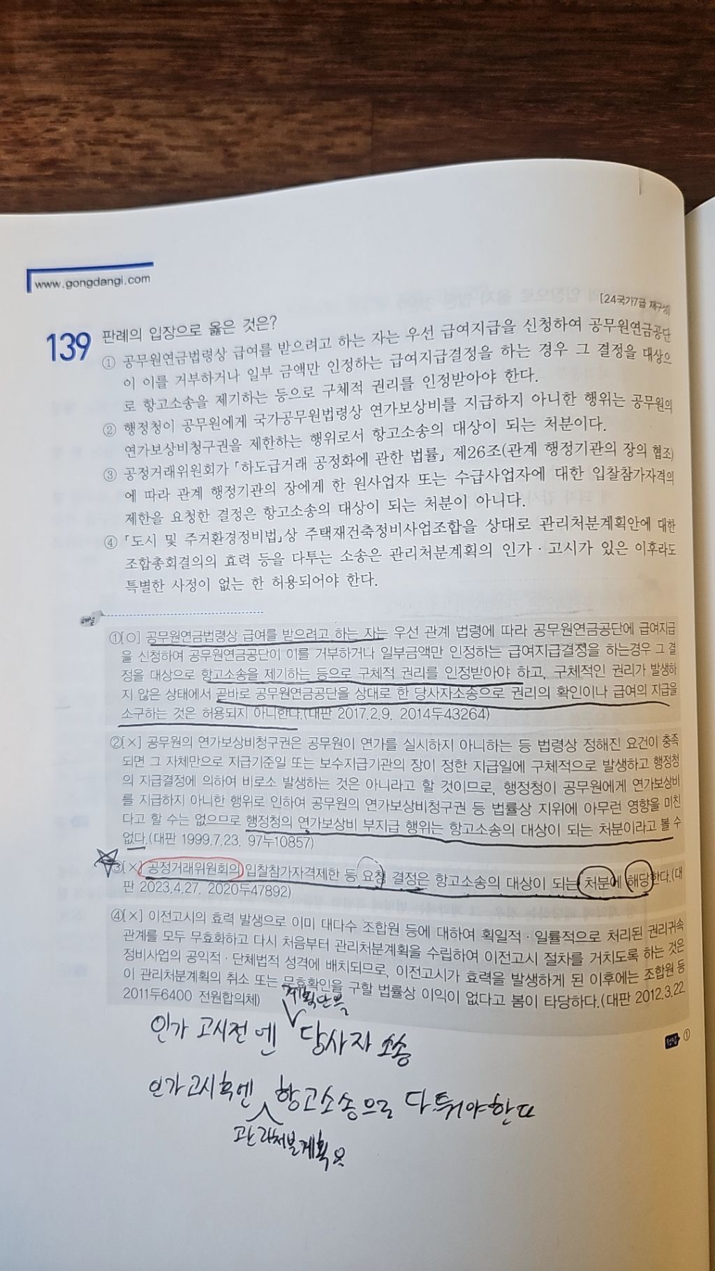 질문드립니다 선생님 작성자행정법초보|작성시간26.03.05|조회수63 목록 댓글 2 글자크기 작게가 글자크기 크게가 139번의 3번 지문과 52번ox문제는 어떻게 구분하는건가요 둘다 요구,요청하는행위인데 하나는 처분성이 인정되고 하나는 처분성이 부정되서 헷갈리네요 다음검색 현재 게시글 추가 기능 열기 북마크 공유하기 신고 센터로 신고 댓글 댓글 2 댓글쓰기 답글쓰기 댓글 리스트 작성자윤우혁 | 작성시간 26.03.05 위는 입찰참가ㅏ제한 요청이고 아래는 형벌권 입니다 수사 요청을 말합니다 답댓글 작성자행정법초보 작성자 본인 여부 작성자 | 작성시간 26.03.05 갑사합니다 선생님 댓글 전체보기