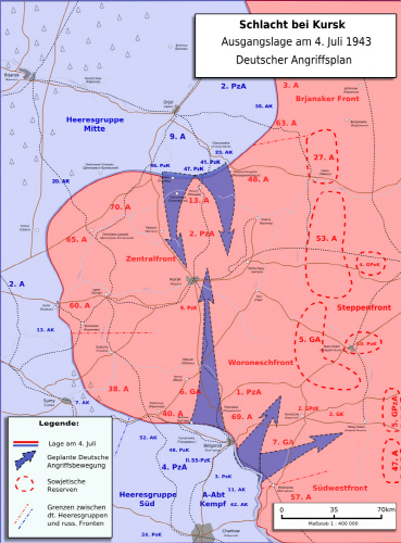 독일은 중부집단군(中部集團軍)이 쿠르스크 돌출부(突出部)의 북(北)에서 남(南)으로, 남부(南部)집단군이 남에서 북으로 진격(進擊)할 예정이었습니다.