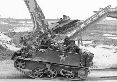 ↑한국전쟁 당시 유니버설 캐리어를 타고 격파된 T-34 옆을 지나는 영국군