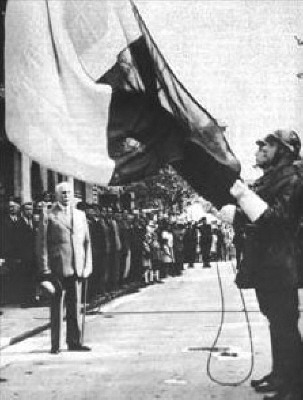 ↑페탱을 수반으로 하여 정부를 수립하고 국기 게양식을 하는 모습