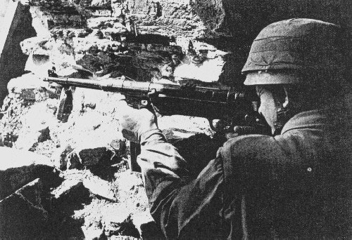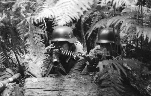 ↑MG42(Maschinengewehr42) 기관총. 제2차 세계대전 중 독일이 사용한 기관총이다. 연사속도(連射速度)가 높아 독특(獨特)한 발사음(發射音)을 내서 ‘히틀러의 전기톱’이라는 별명(別名)을 가지고 있다.