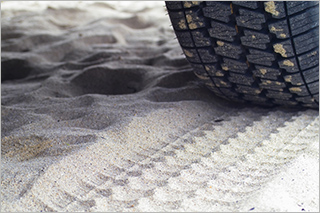 자동차 앞바퀴가 모래밭에 빠져서