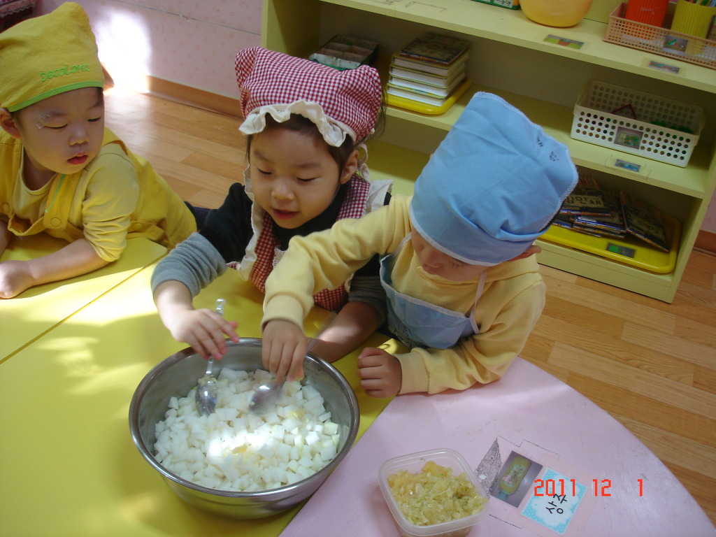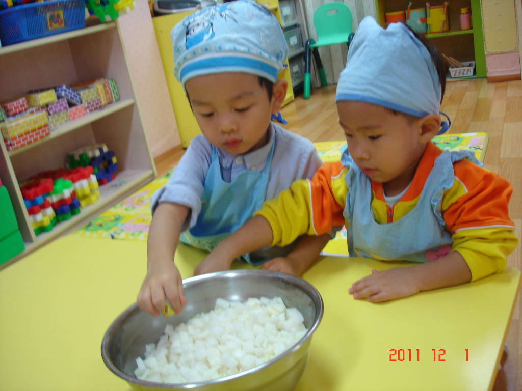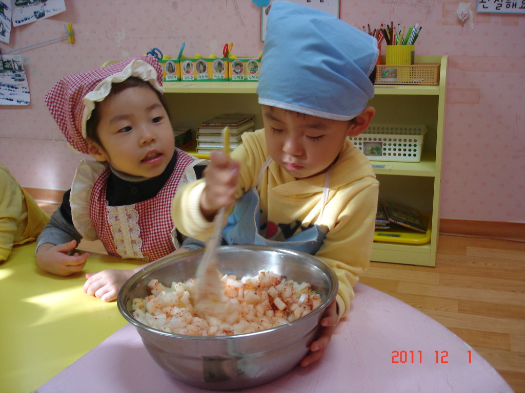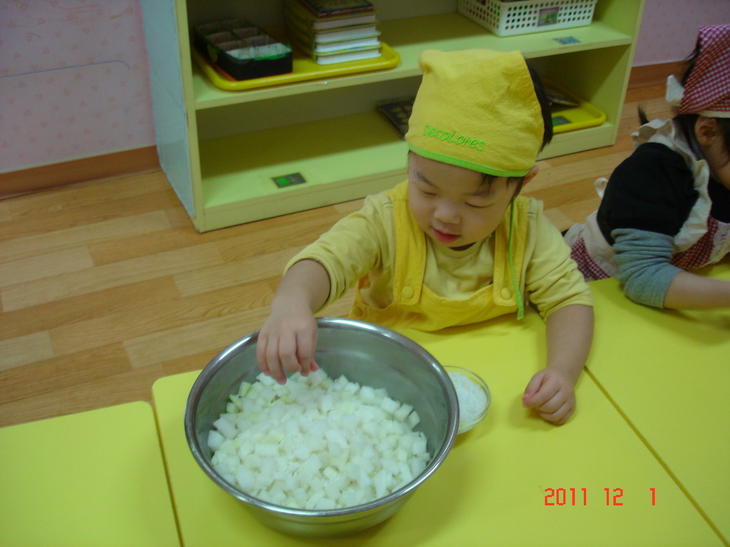무를 썰었어요~! 우리 친구들이 가져온 소금, 고춧가루 ,마늘을 넣어서 맛있는 깍두기를 만들었어요~!