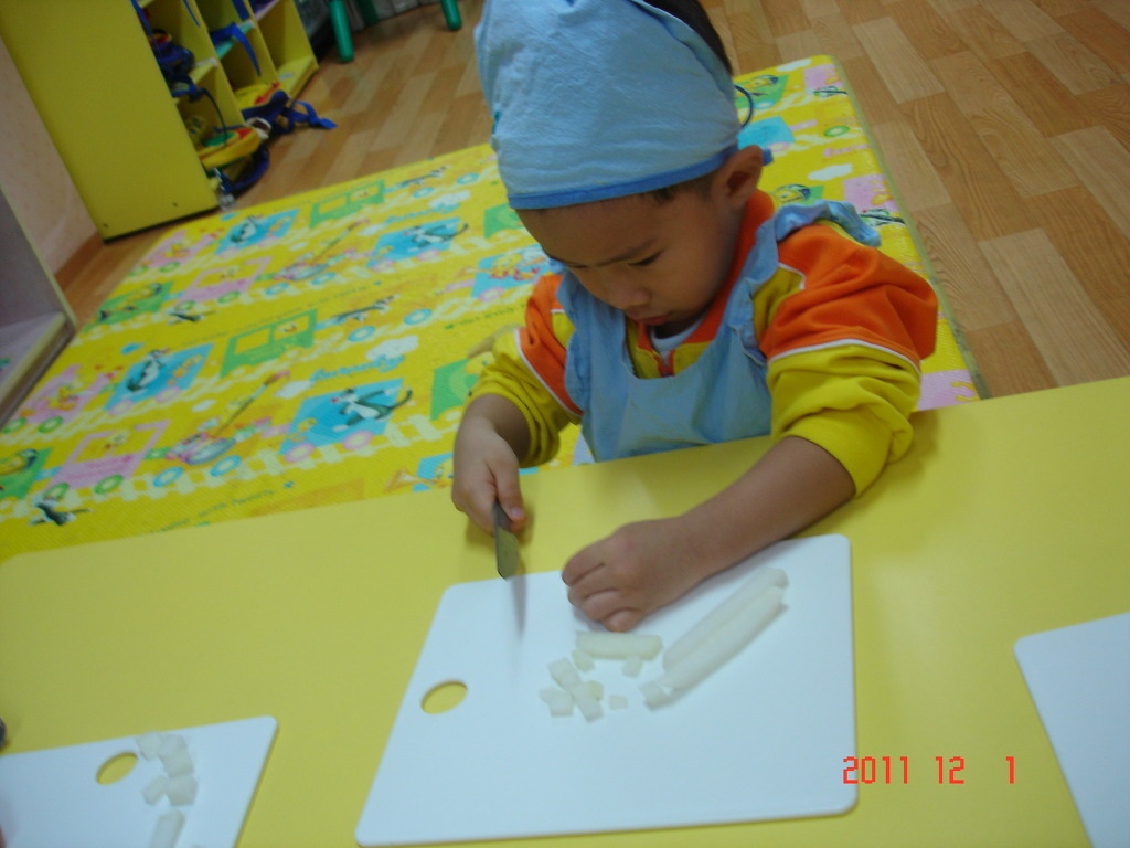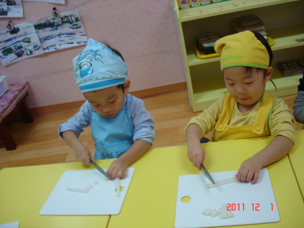 빵칼로 싹둑 싹둑~ 네모로 무를 잘라 보았어요. " 선생님, 다 잘랐어요" 하며 계속 무를 달라고 말하며 열심히