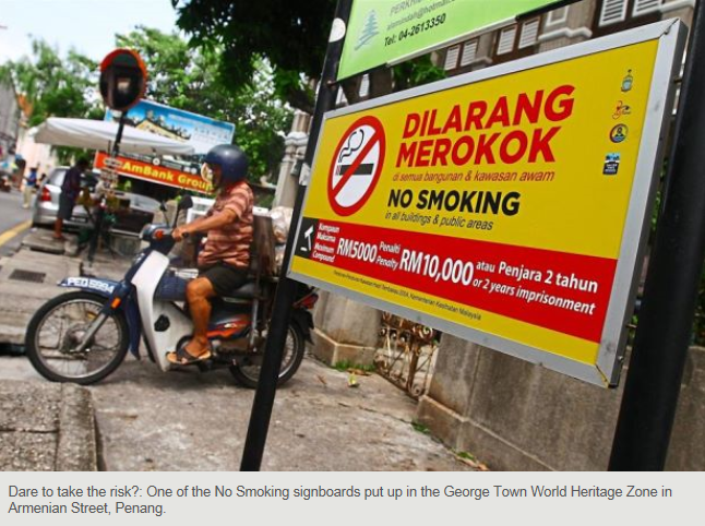 - 페낭 조지타운 헤리테이지 구역 흡연금지 실시 동양의 진주라 불리우는 말레이시아 페낭의 조지타운 헤리테이지 구역에 흡연금지령이 내려졋다. 앞으로 말레이시아 전지역에 흡연금지령을 내린다고 하니 말레이시아에 거주하는 교민과 방문객은 참고를 해야 피해를 당하지 않을 검 임. 페낭의 조지타운 헤리테이지 구역에서 흡연금지령을 위반하여 적발될시 RM5000(1백5십만원)과 RM1,000(3백만원) 상당의 벌금이나 2년의 징역형에 처한다고 하니 이참에 담베 끊으세요