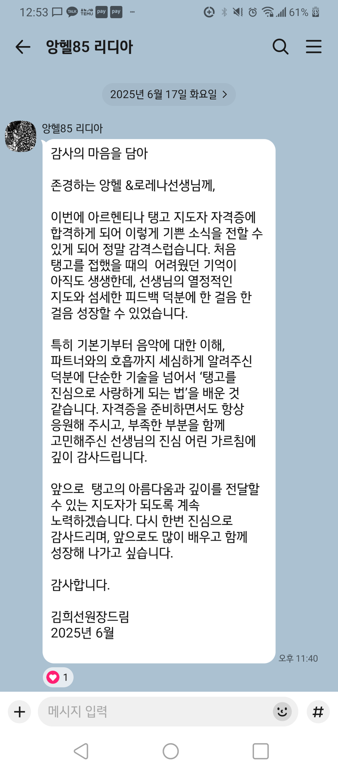 앞으로 탱고의 아름다움과 깊이를 전달할 수 있는 지도자가 되도록 계속 노력하겠습니다. 다시 한번 진심으로 감사드리며, 앞으로도 많이 배우고 함께 성장해 나가고 싶습니다.
