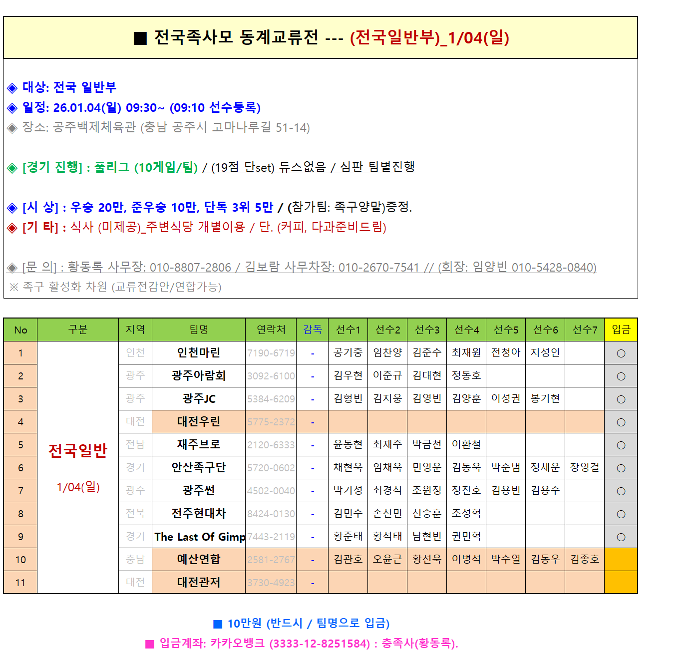 [스크랩] [참가현황](접수마감) --- 1/04(일) 전국일반. --- (입금 및 선수명단 요청) 작성자김근수(안산소진이)|작성시간25.12.31|조회수86 목록 댓글 0 글자크기 작게가 글자크기 크게가 다음검색 스크랩 원문 : 전국족구사랑모임 현재 게시글 추가 기능 열기 북마크 공유하기 신고 센터로 신고 댓글 댓글 0 댓글쓰기 답글쓰기 댓글 리스트