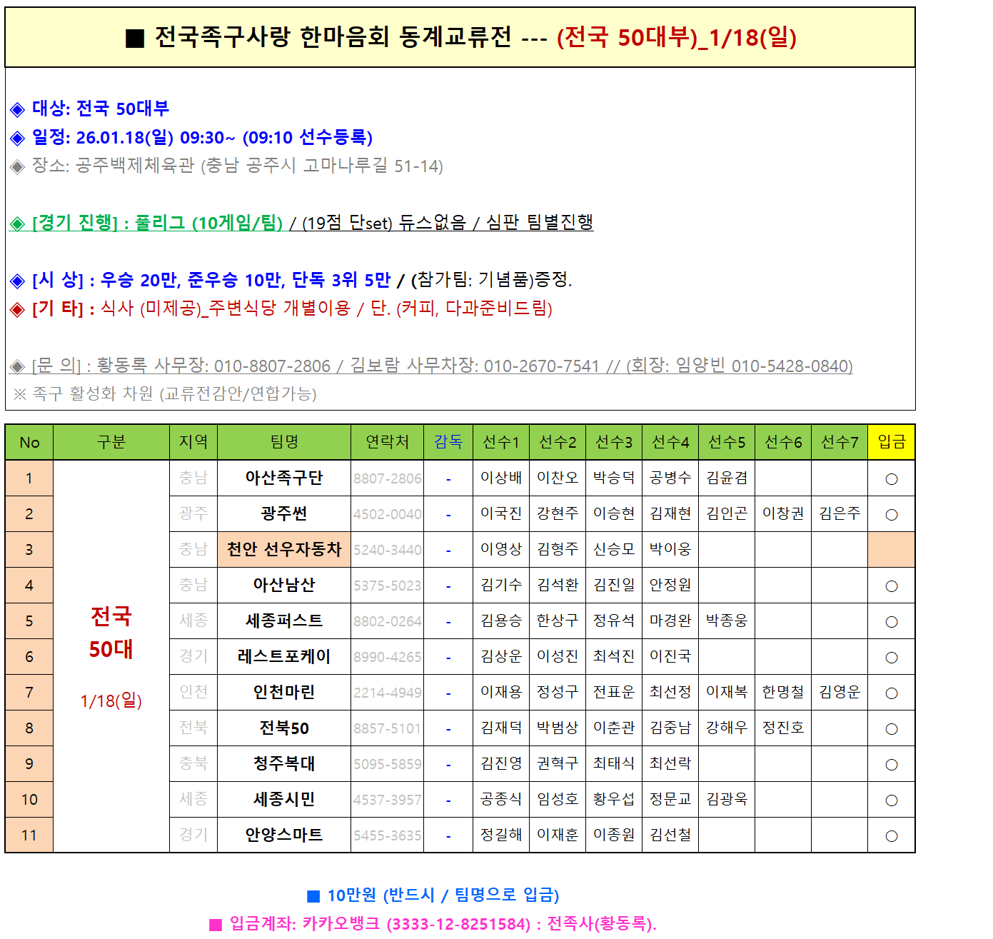 [스크랩] [참가현황]1/18(일) 전국50대 (접수마감) ----- (참가팀명 입금) 요청. 작성자김근수(안산소진이)|작성시간26.01.07|조회수40 목록 댓글 0 글자크기 작게가 글자크기 크게가 다음검색 스크랩 원문 : 전국족구사랑모임 현재 게시글 추가 기능 열기 북마크 공유하기 신고 센터로 신고 댓글 댓글 0 댓글쓰기 답글쓰기 댓글 리스트