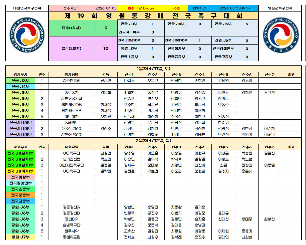 [참가현황]제19회 영월동강배 전국족구대회 참가현황(3/30일, 19:50 기준) 작성자김근수(안산소진이)|작성시간26.03.31|조회수40 목록 댓글 0 글자크기 작게가 글자크기 크게가 ❇️참가 접수 시 아래의 내용을 참고 부탁드립니다. 1. 참가 팀 등록 시 서브 로테이션 순번대로 등록 2. 선수 및 감독 변경은 참가 접수 마감 시까지 자유롭게 가능 다음검색 현재 게시글 추가 기능 열기 북마크 공유하기 신고 센터로 신고 댓글 댓글 0 댓글쓰기 답글쓰기 댓글 리스트