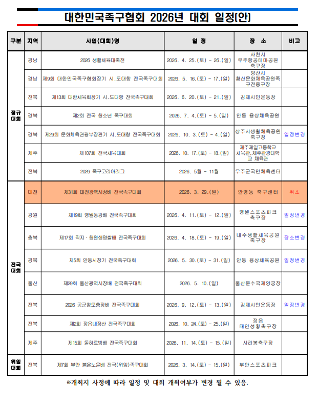 [공지사항]대한민국 족구협회 2026년 사업계획(2026.03.25)수정 작성자김근수(안산소진이)|작성시간26.01.22|조회수320 목록 댓글 0 글자크기 작게가 글자크기 크게가 첨부파일파일이미지2026년 대회계획(안)_공지.pdf 다음검색 현재 게시글 추가 기능 열기 북마크 공유하기 신고 센터로 신고 댓글 댓글 0 댓글쓰기 답글쓰기 댓글 리스트