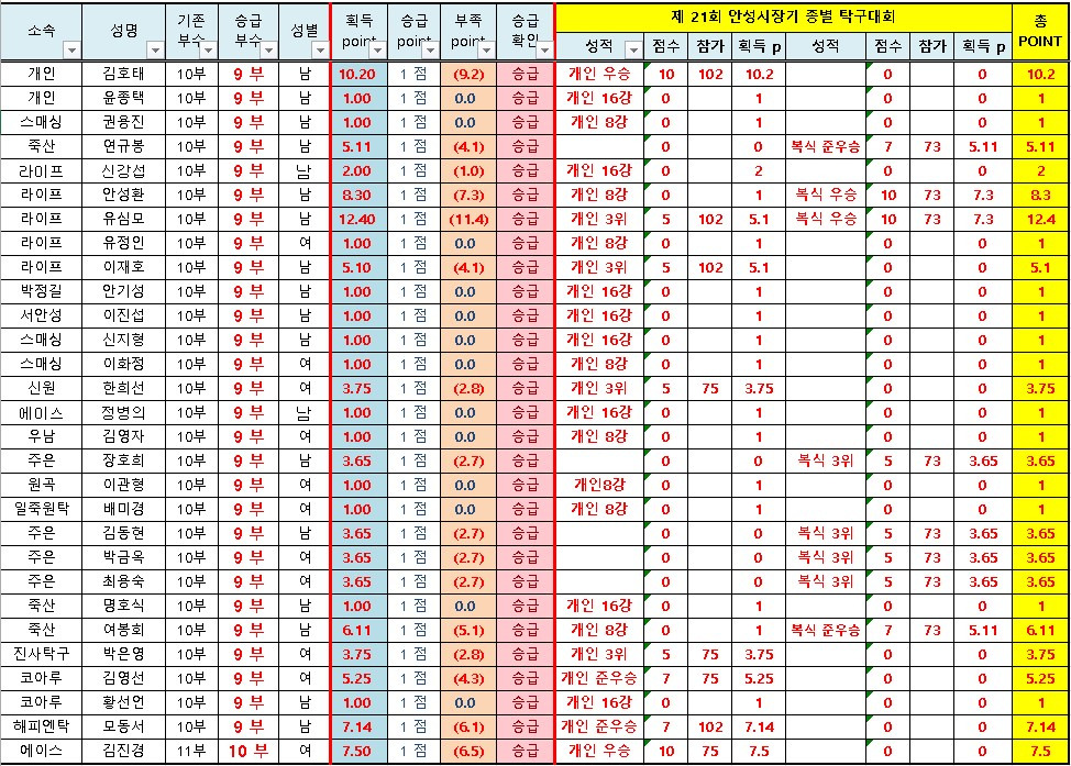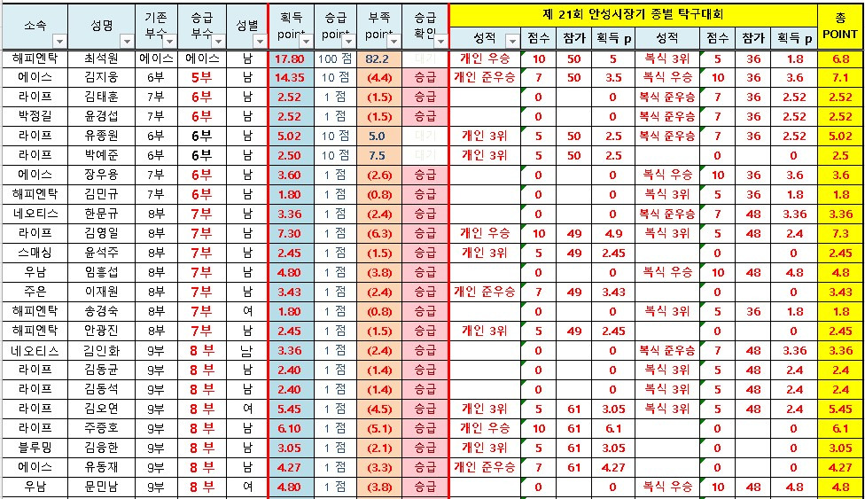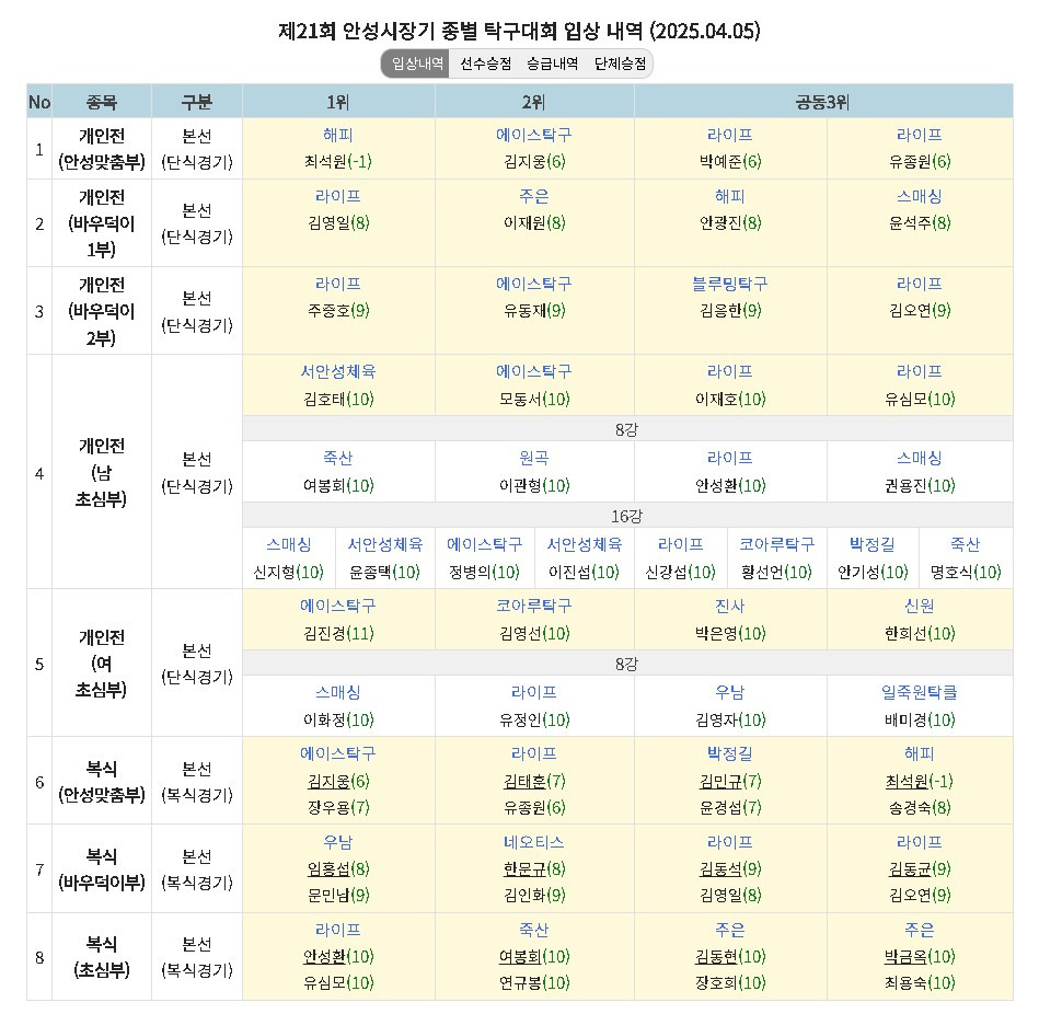 지난 4월 5일에 개최된 안성시장기 종별 탁구대회 결과를 공지합니다.