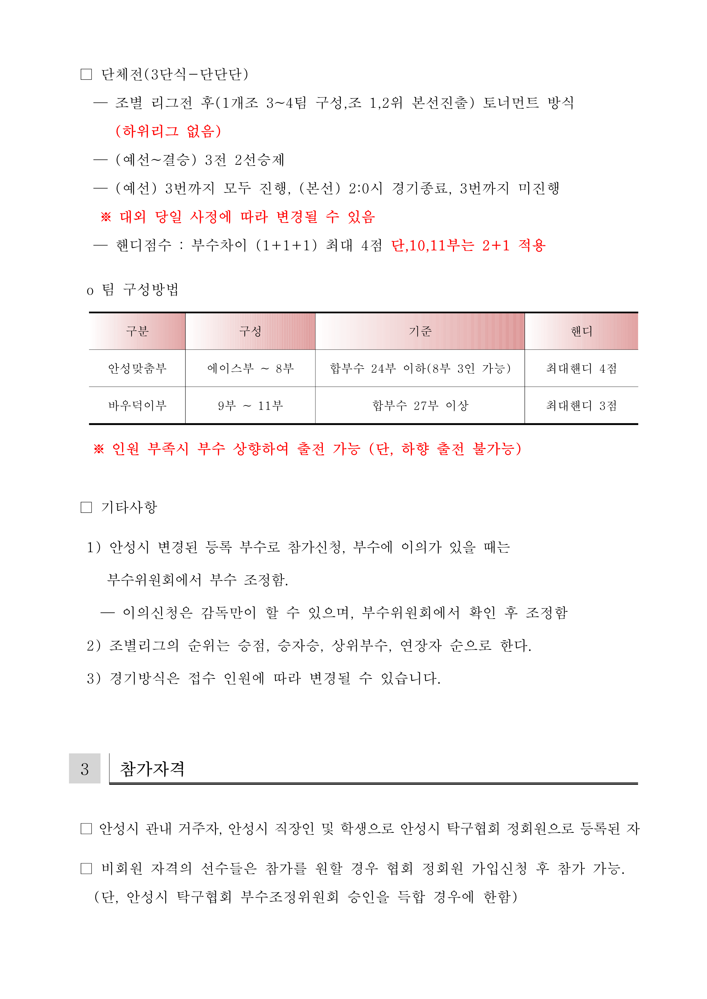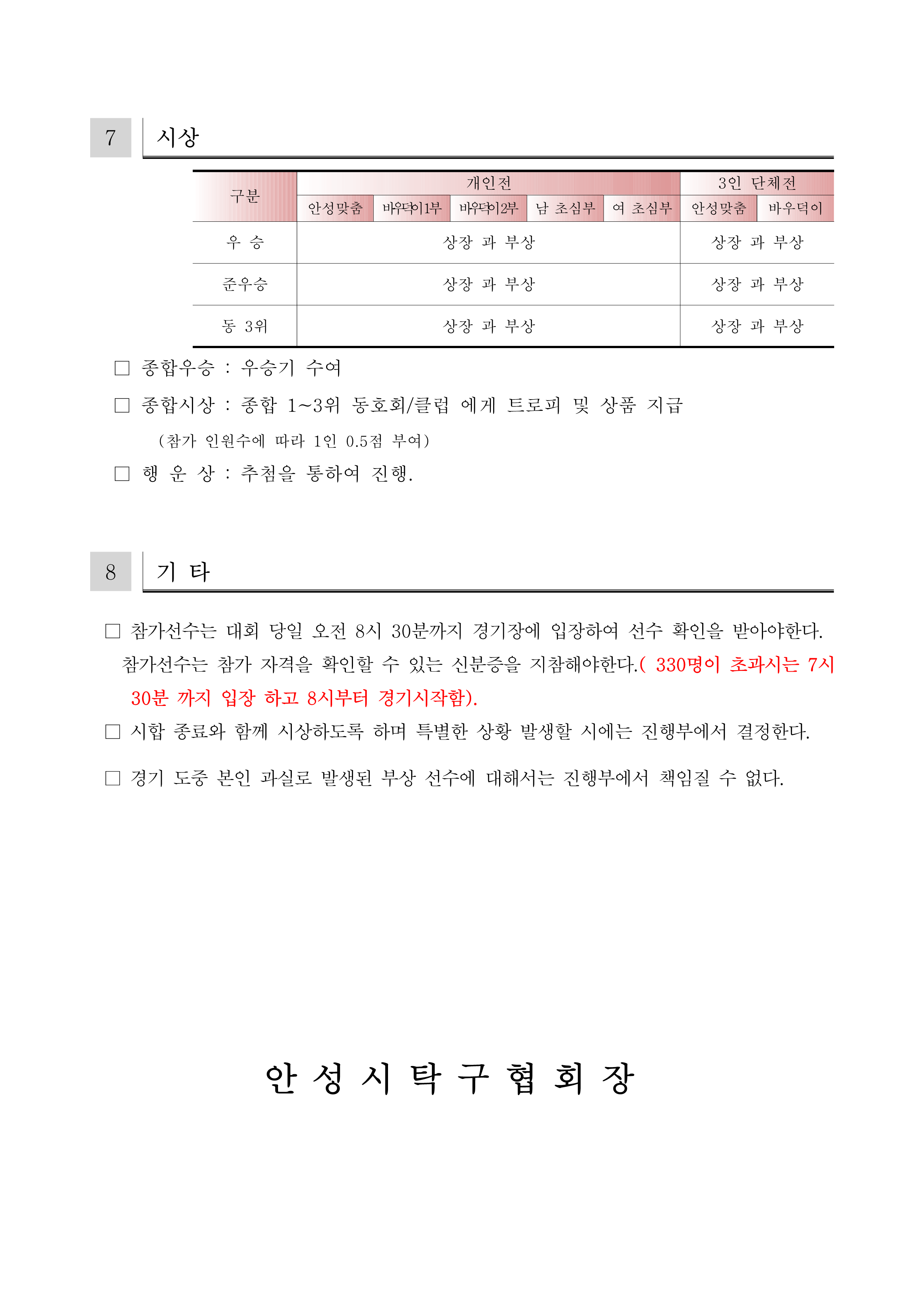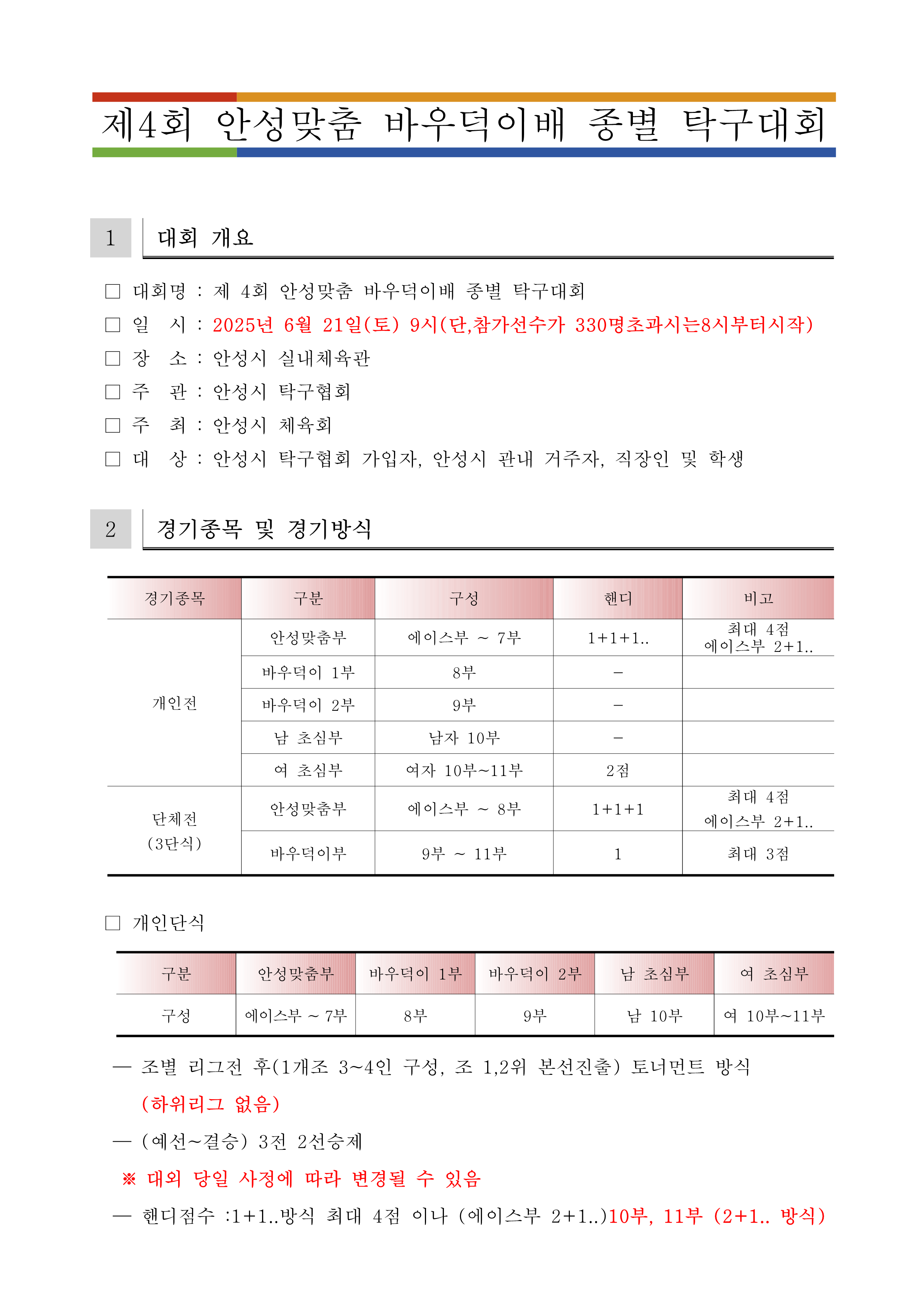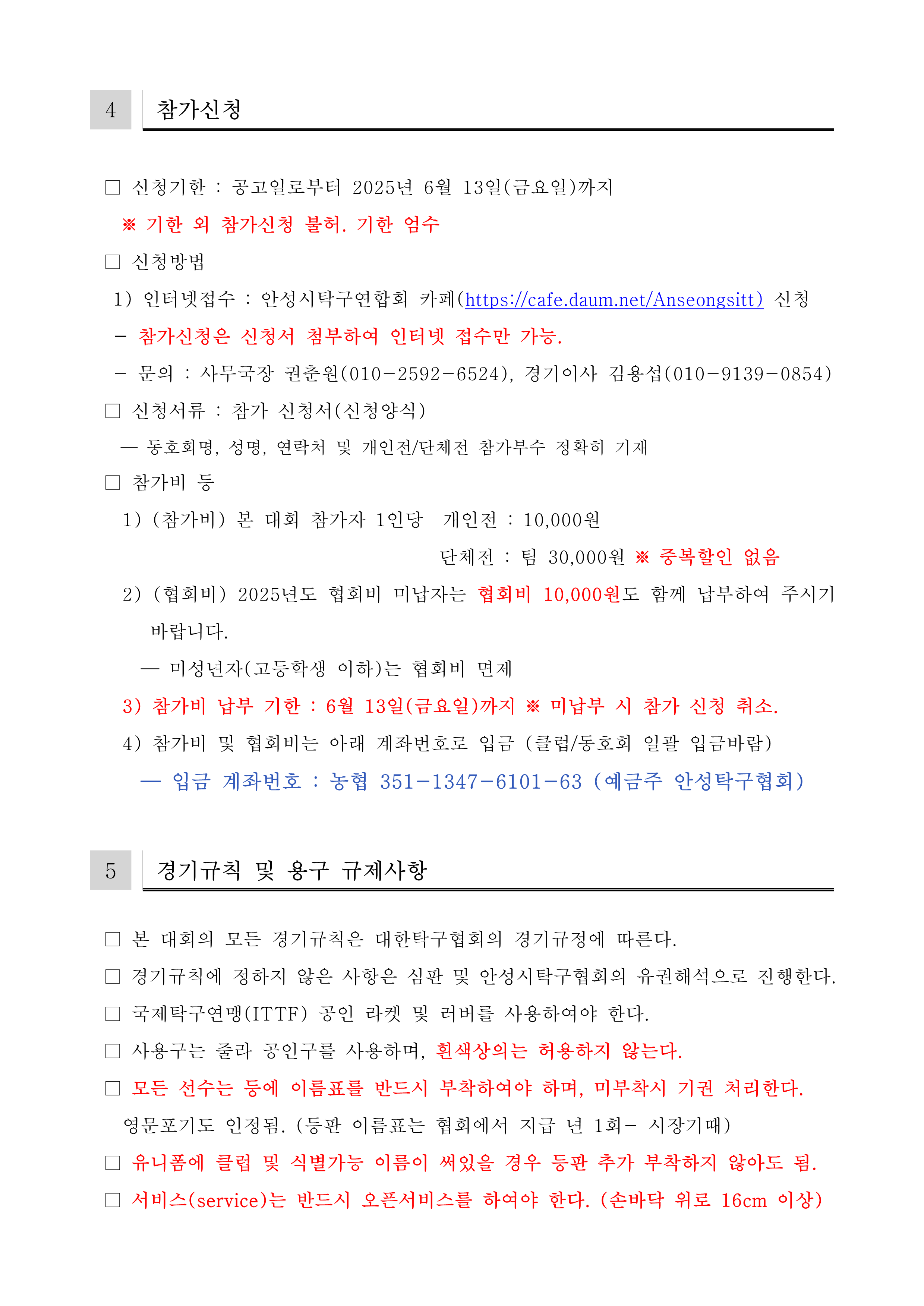 제4회 안성맞춤 바우덕이배 종별 탁구대회 작성자유동재|작성시간25.05.12|조회수318 목록 댓글 3 글자크기 작게가 글자크기 크게가 ※ 무소속, 개인 참가자 분들도 아래 첨부파일 중 참가신청서를 작성하시어 바우덕이 카테고리의 제4회(2025)에 참가신청 해주시면 되겠습니다제 4회 안성맞춤 바우덕이배 종별 탁구대회.pdf201.51KB제 4회 안성맞춤 바우덕이배 종별 탁구대회 참가신청서.xlsx35.36KB 첨부파일첨부된 파일이 7개 있습니다. png 파일 제 4회 안성맞춤 바우덕이배 종별 탁구대회_2.png 다운로드 png 파일 제 4회 안성맞춤 바우덕이배 종별 탁구대회_5.png 다운로드 png 파일 제 4회 안성맞춤 바우덕이배 종별 탁구대회_1.png 다운로드 png 파일 제 4회 안성맞춤 바우덕이배 종별 탁구대회_3.png 다운로드 png 파일 제 4회 안성맞춤 바우덕이배 종별 탁구대회_4.png 다운로드 pdf 파일 제 4회 안성맞춤 바우덕이배 종별 탁구대회.pdf 다운로드 xlsx 파일 제 4회 안성맞춤 바우덕이배 종별 탁구대회 참가신청서.xlsx 다운로드 다음검색 현재 게시글 추가 기능 열기 북마크 공유하기 신고 센터로 신고 댓글 댓글 3 댓글쓰기 답글쓰기 댓글 리스트 작성자정다안 | 작성시간 25.06.02 참가신청 정다안 9부/바우덕이 2부010-8903-4477 작성자쿠키3179 | 작성시간 25.06.11 개인단식 no 성명 부수 구분 성별 비고1 이재경 7 안성맞춤부 남 2 이상한 9 바우덕이2부 남 3 류재문 10 남초심부 남 4 왕규용 10 남초심부 남 5 동신탁구동호회 신청합니다수고하세요~~ 작성자쿠키3179 | 작성시간 25.06.12 동신탁구회 단체전 1팀 신청합니다이상한9,류재문10,완규용10 모두남자입니다수고하세요 댓글 전체보기