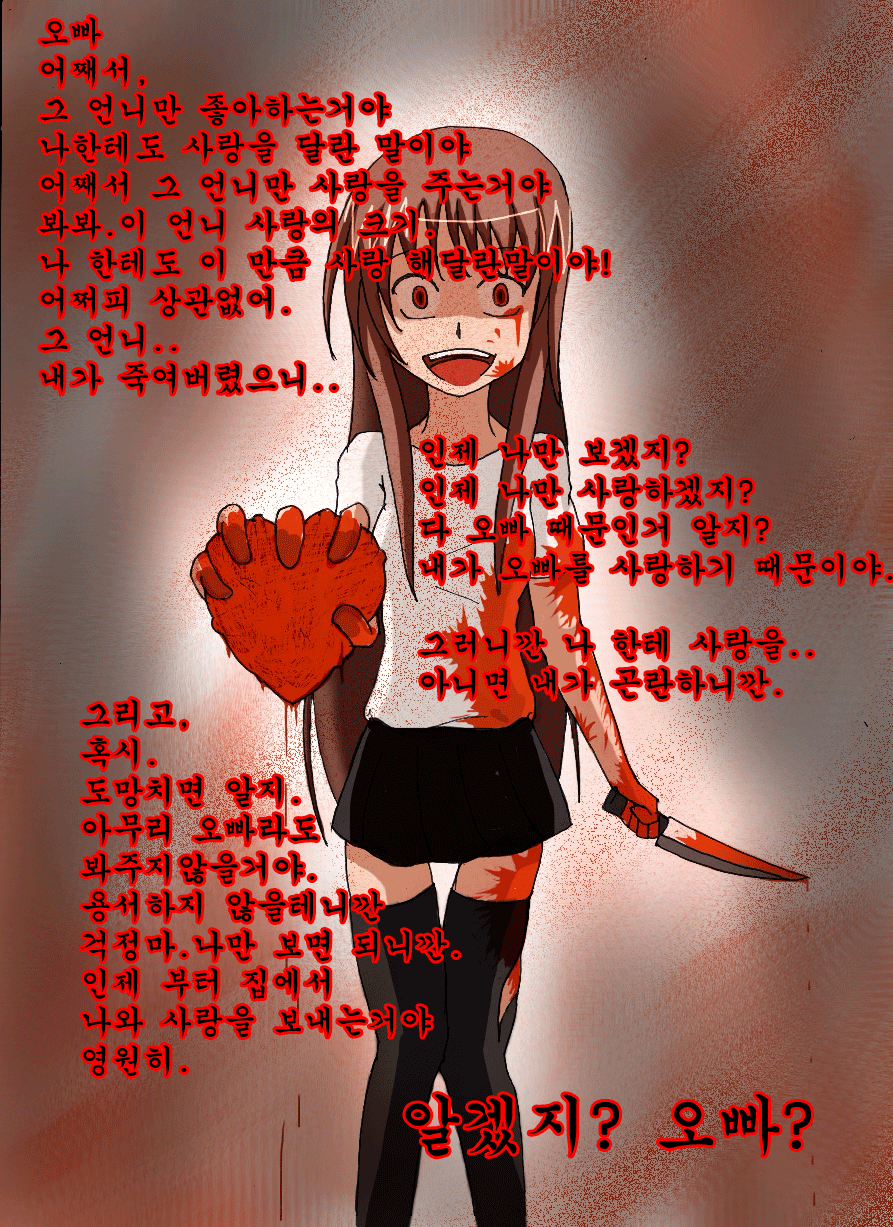 만약... 지금 사진처럼 여동생이 얀데레인걸 몰랐다... 그런데 여자친구를 사귄다? 그거 지금 죽으려고 작정한 것이지요? 만약 주위에 얀데레가 있다면 다른 여자에게 한눈을 팔지는 마십시오. 그게.. 여동생인 경우가 가장 얀데레가 되었을 경우 리스크가 큽니다. 불륜..천륜을 거스를떄 여동생은 가장 독한마음을 먹기 때문이지오.