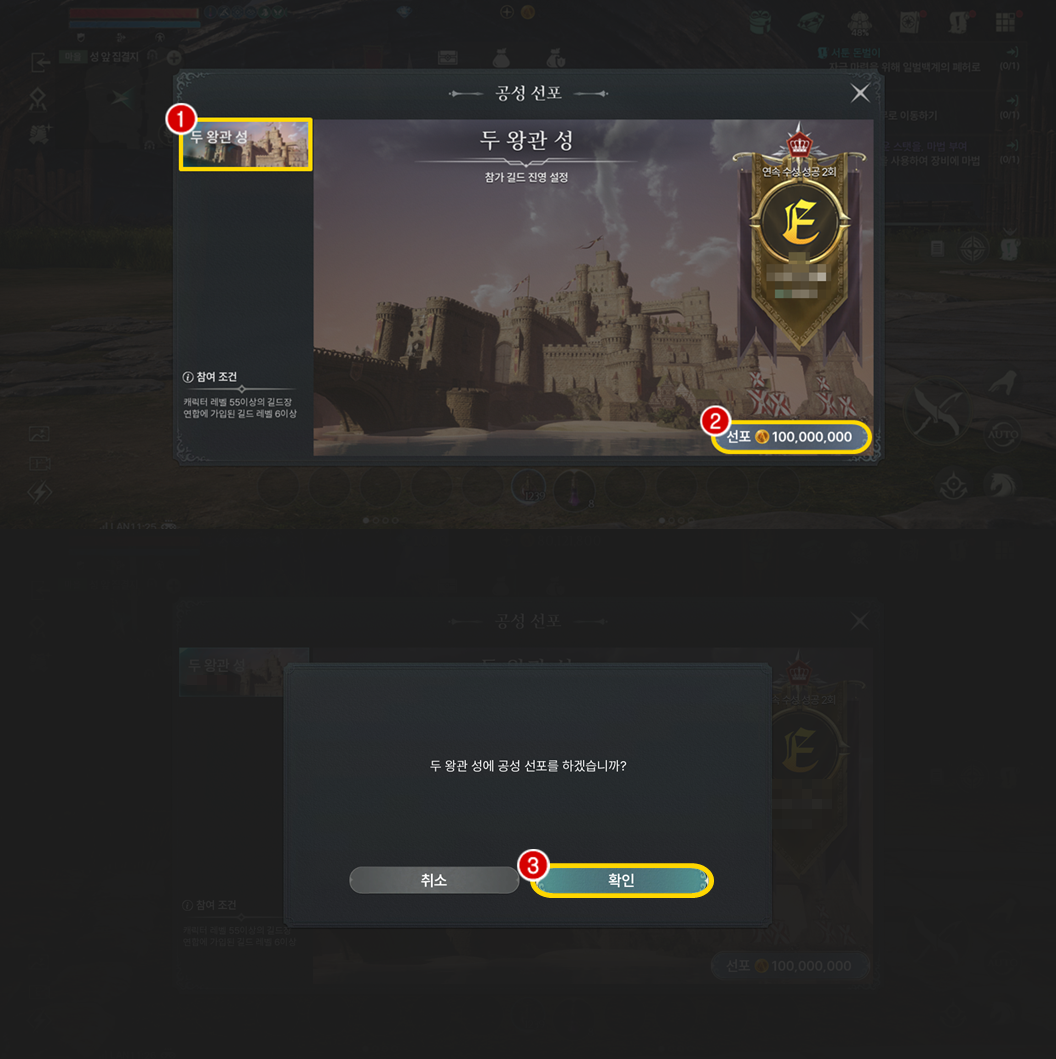 - 연합에 가입된 길드 레벨 6 이상의 길드장만 공성 선포가 가능합니다.