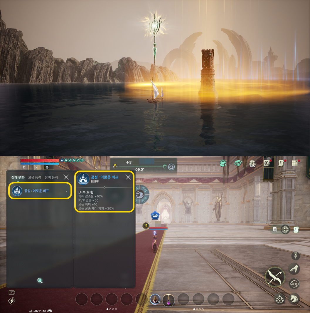 - 바다 전투에서 지배자의 깃발을 마력탑에 꽂으면 외성과 내성에서 육상 전투를 진행하는 연합에 강력한 버프 효과가 적용됩니다.