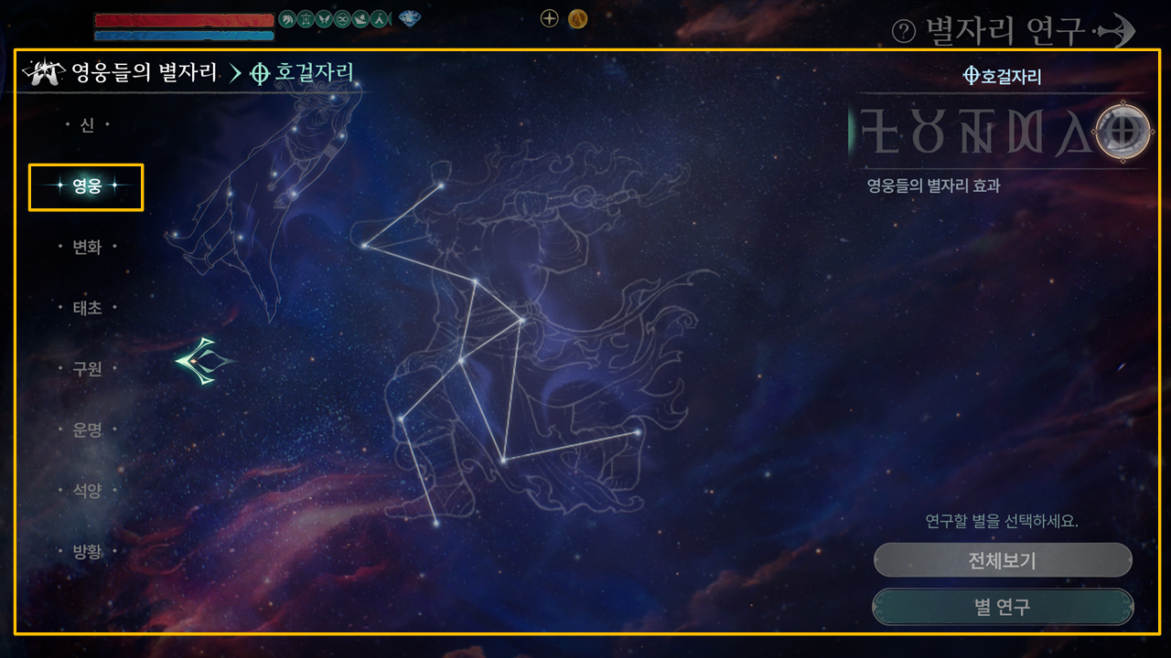 | 개벽의 위상 | 2-3 | - | 영웅 - 새로운 별자리 오픈 · 영웅 - 표범자리 연구 완료 시 호걸자리를 연구할 수 있습니다. | |