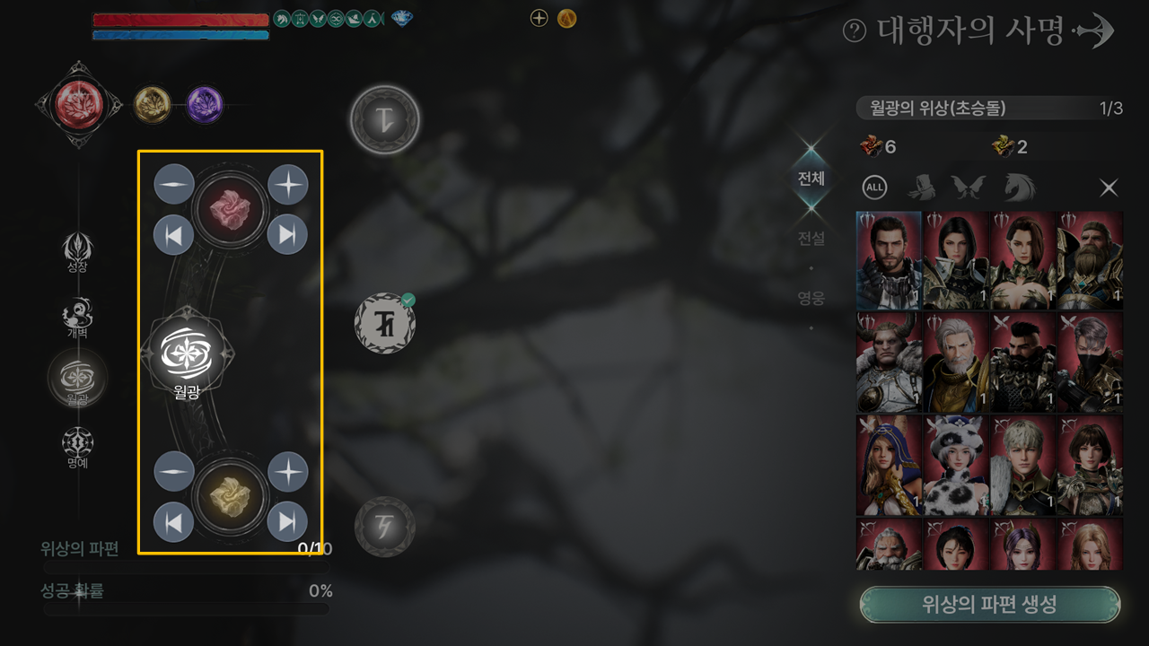 | 월광의 위상 | 3 | - | 보라 초승돌 증폭 효과의 추가 효과 ▶ 보라 초승돌 3효과 모든 회피 +1 → 모든 회피 +2 ▶ 보라 초승돌 6효과 모든 회피 +2 → 모든 회피 +3 ▶ 보라 초승돌 9효과 모든 회피 +3 → 모든 회피 +4 기술 공격력 증폭 +5% → 기술 공격력 증폭 +6% ▶ 보라 초승돌 12효과 모든 회피 +4 → 모든 회피 +5 기술 공격력 증폭 +10% → 기술 공격력 증폭 +12% ▶ 보라 초승돌 15효과 모든 회피 +6 → 모든 회피 +8 기술 공격력 증폭 +15% → 기술 공격력 증폭 +17% 모든 피해 면역 5% → 모든 피해 면역 6% | |