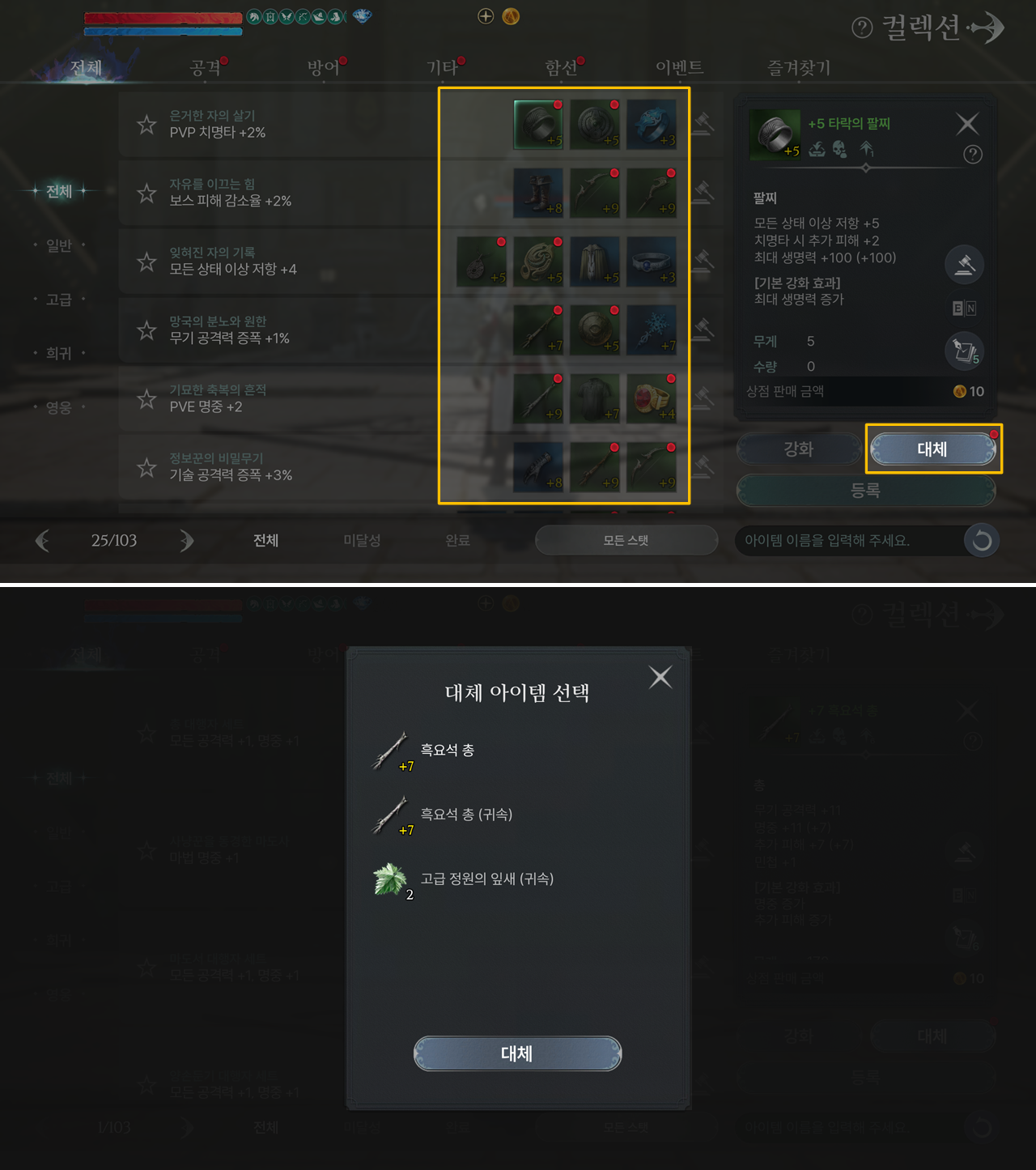 · 컬렉션 요구 아이템의 강화 단계에 따라 정원의 잎새 (귀속)의 대체 등록량이 달라집니다.