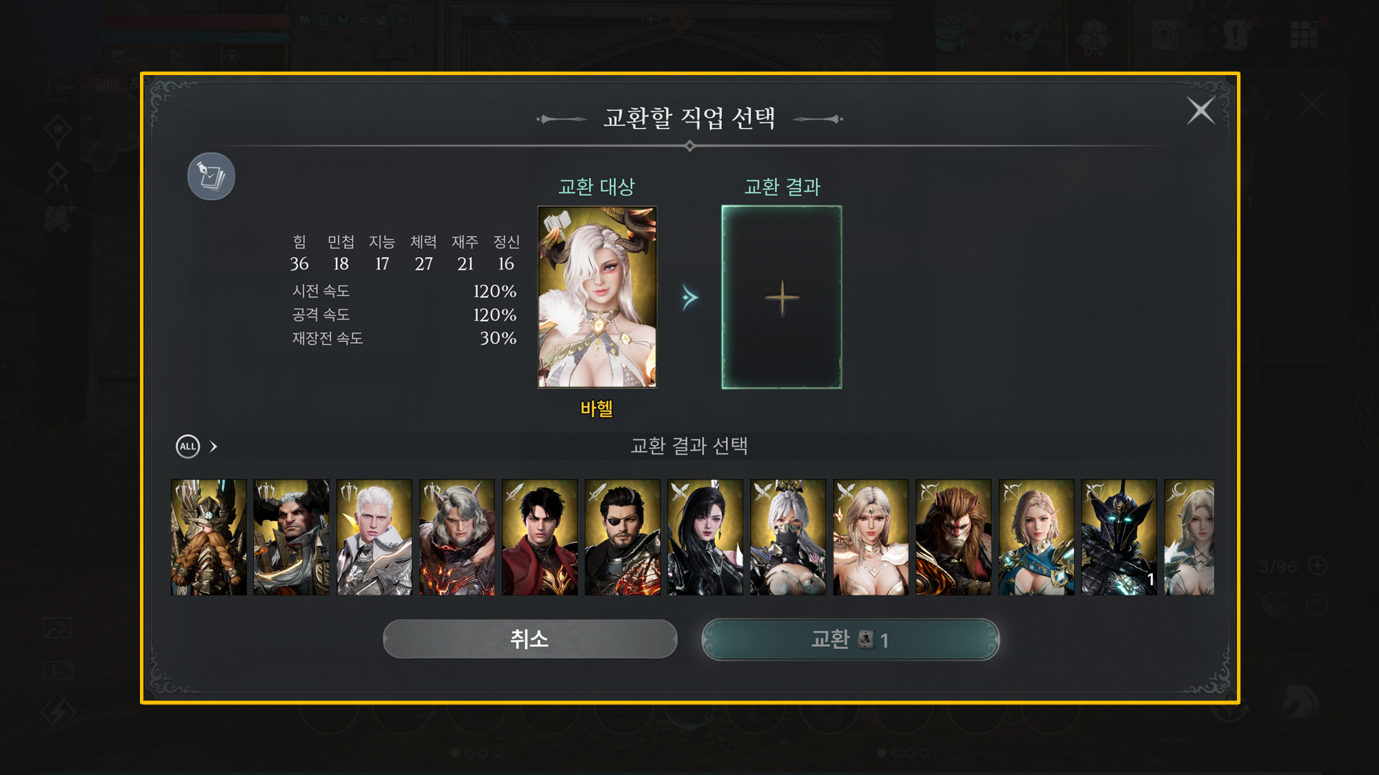ⓘ 10월 23일(수) 업데이트를 통해 추가된 신규 직업 3종(아즈란, 델하르트, 페르바나)은 교환 대상으로만 선택 가능하며,