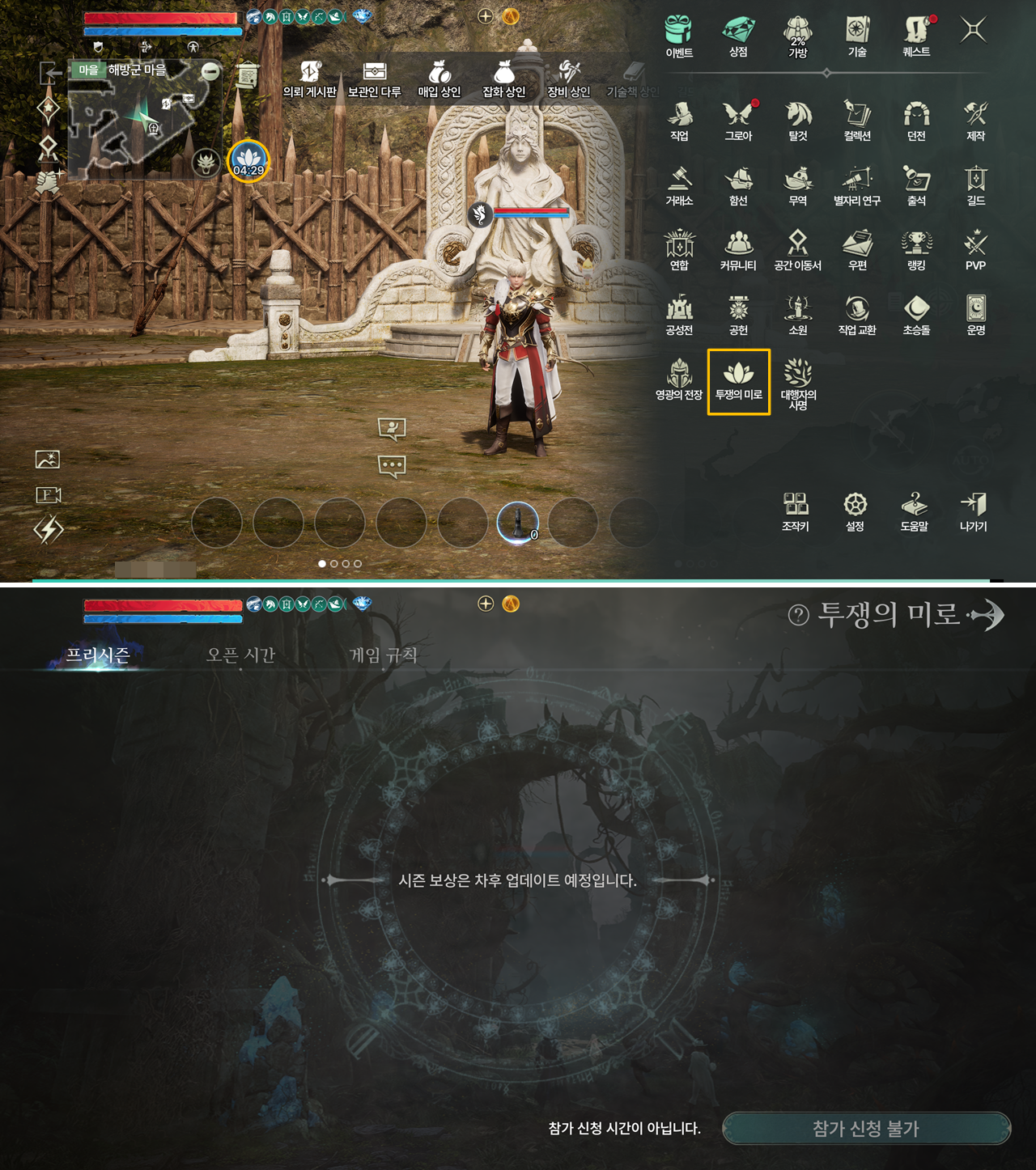 - 게임 내 [메뉴 - 투쟁의 미로] 입장 후 우측 하단에서 참가 신청을 먼저 진행합니다.
