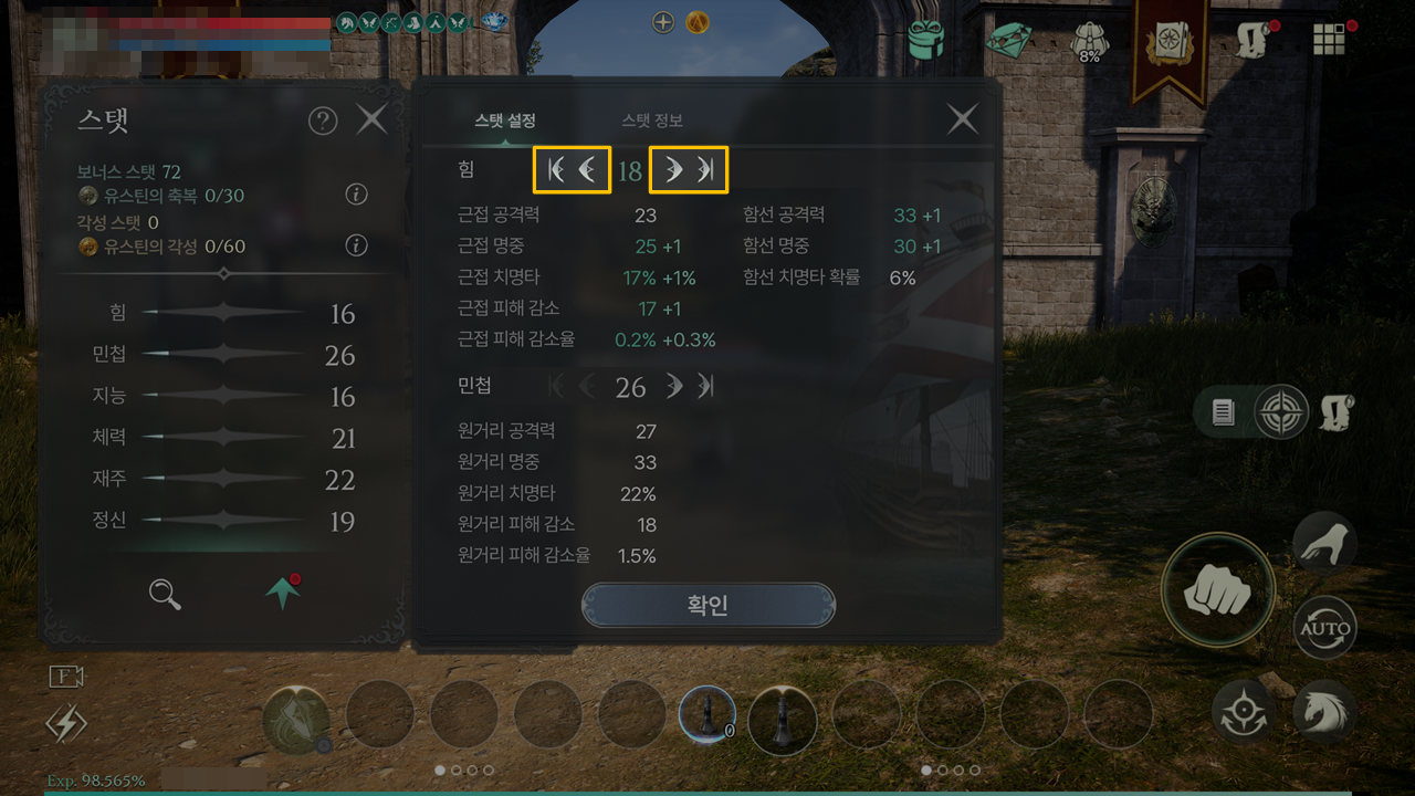 - 스탯 설정 팝업에서 [←, → 버튼] 선택 시 1개 스탯만 조정되며, [⇤, ⇥ 버튼] 선택 시 최대 스탯이 조정됩니다.