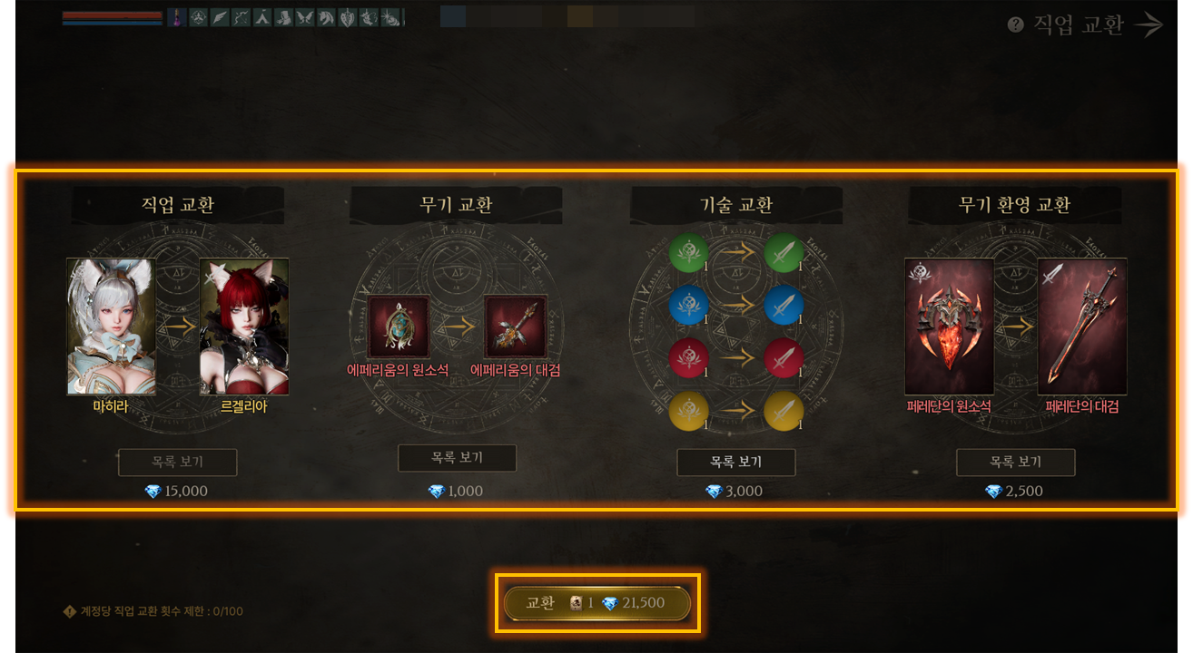 · 직업 교환은 선택에 따라 보유한 한손검, 양손검, 단검, 양손둔기, 곡도, 활, 총, 지팡이, 마도서, 원소석 태초~영웅 등급 직업 중
