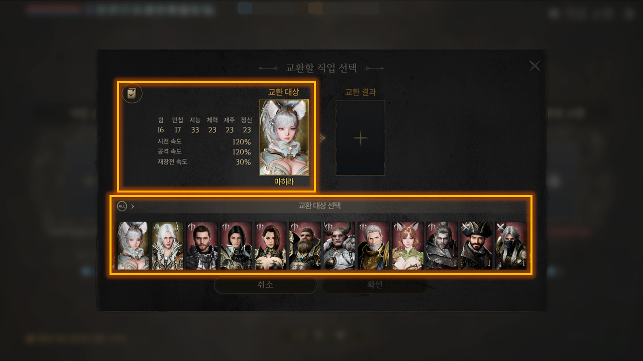 · 교환 대상 직업의 종류에 따라 교환 결과로 선택 가능한 직업/무기/기술/무기 환영이 변경됩니다.