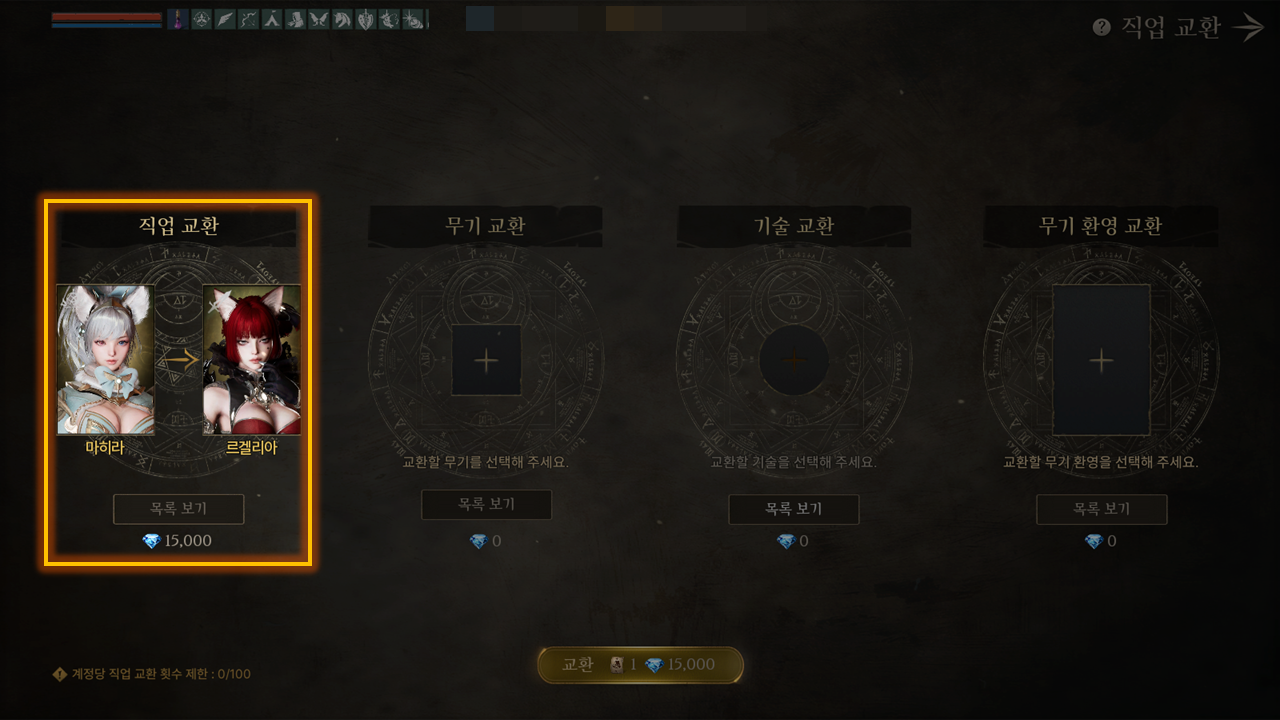 - 직업 교환은 계정 당 1회만 가능하고 직업을 선택하면 무기/기술/무기 환영을 선택하여 함께 교환할 수 있으며,