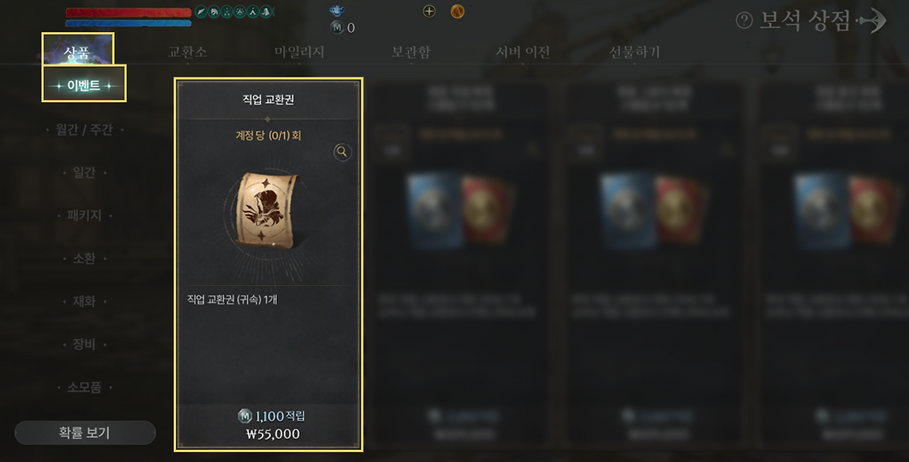 - 직업 교환권 (귀속) 상품은 계정 당 1회만 구매할 수 있습니다.