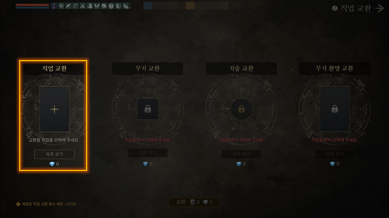 · 직업 교환은 [직업 선택 → 무기 선택 → 기술 선택 → 무기 환영 선택] 순으로 진행되며,