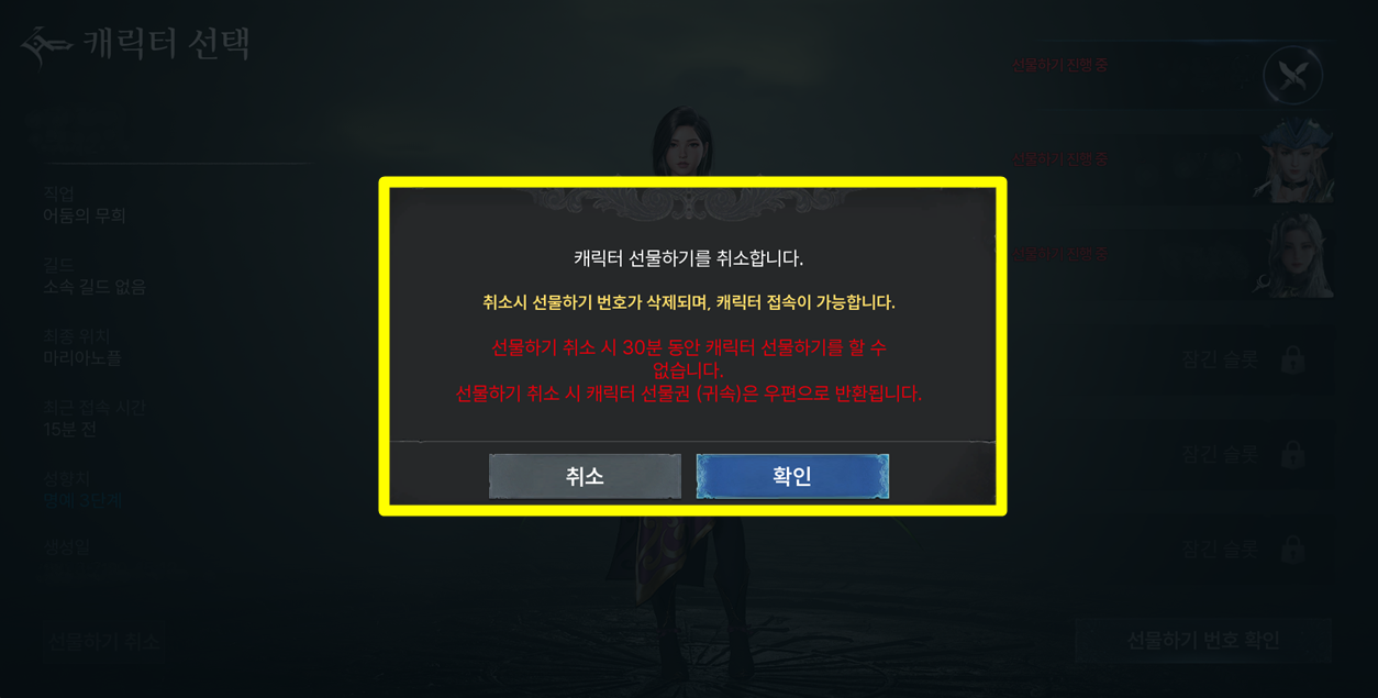 - 좌측 하단에 [선물하기 취소] 버튼을 클릭 후 [확인] 버튼을 클릭하면 선물하기가 취소되며, 캐릭터 접속이 가능해 집니다.